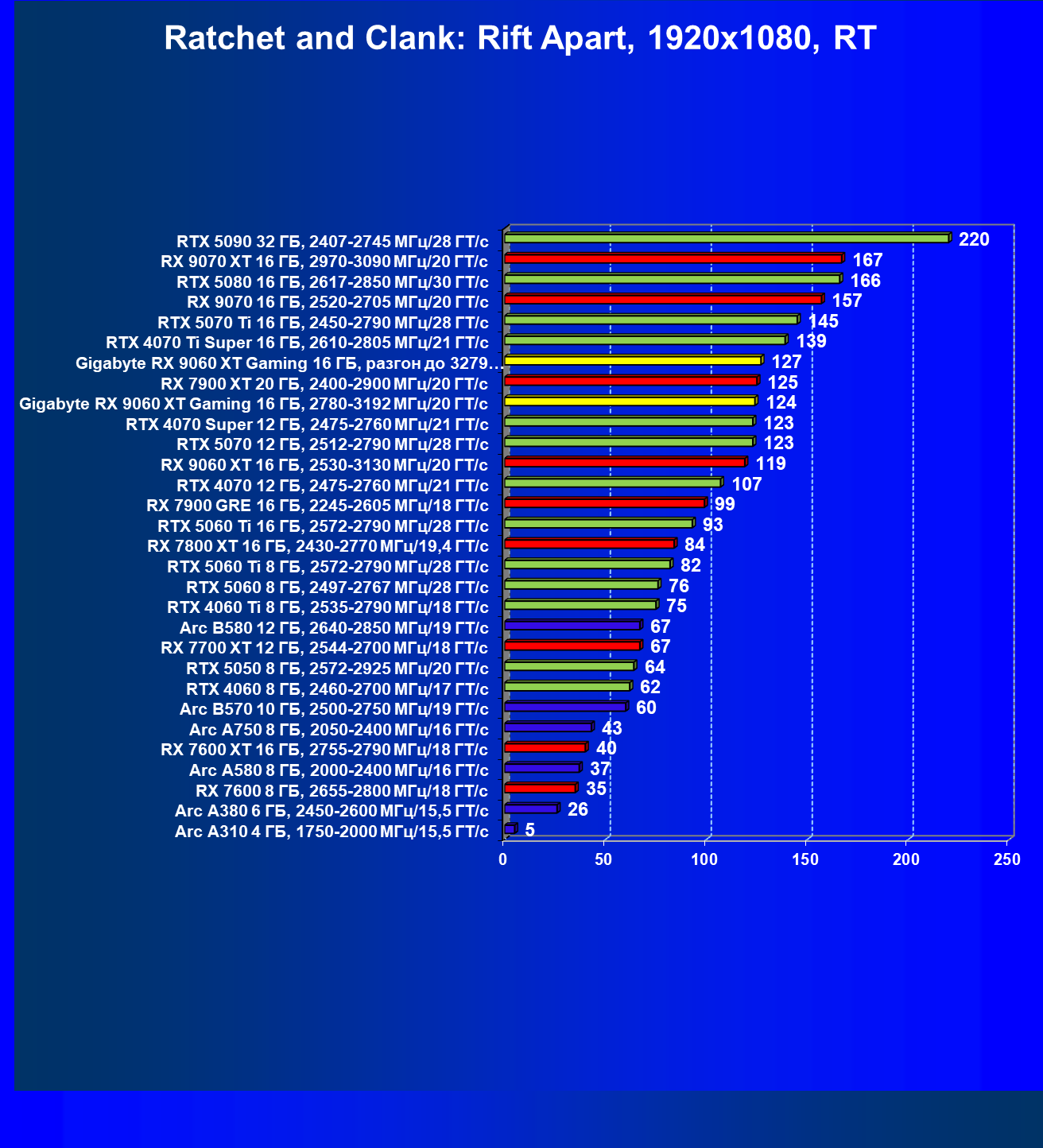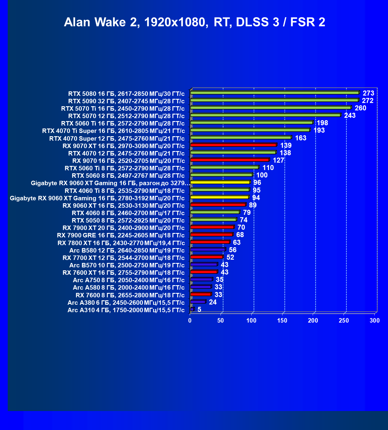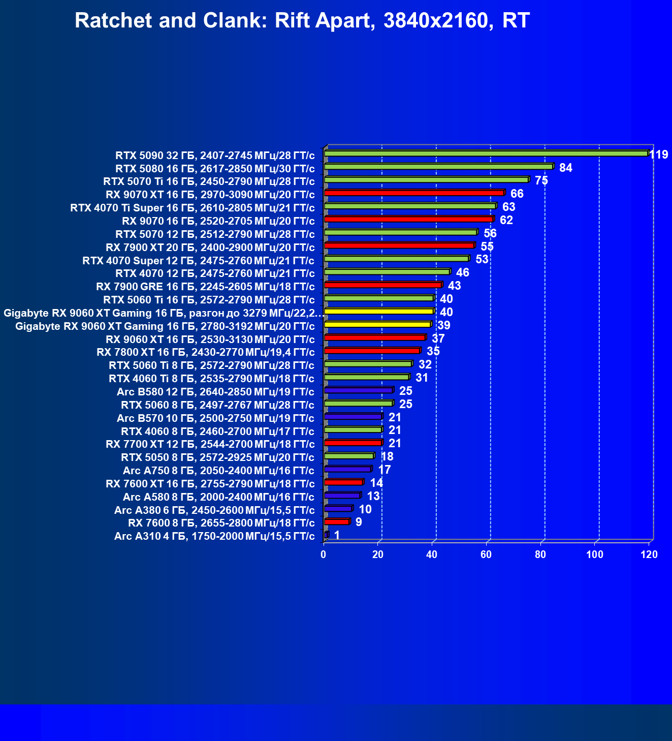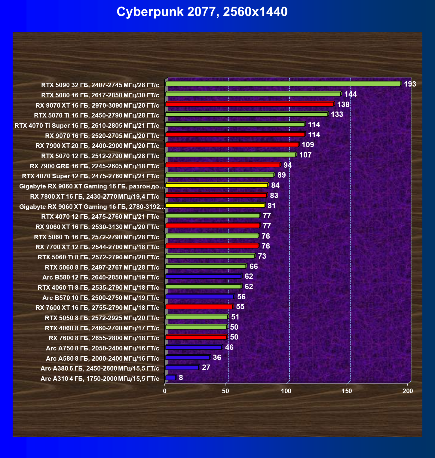 | 07 | Gigabyte RX 9060 XT Gaming 16 ГБ, разгон до 3279 МГц/22,2 ГТ/с | 581 | 2616 | 45 000 |