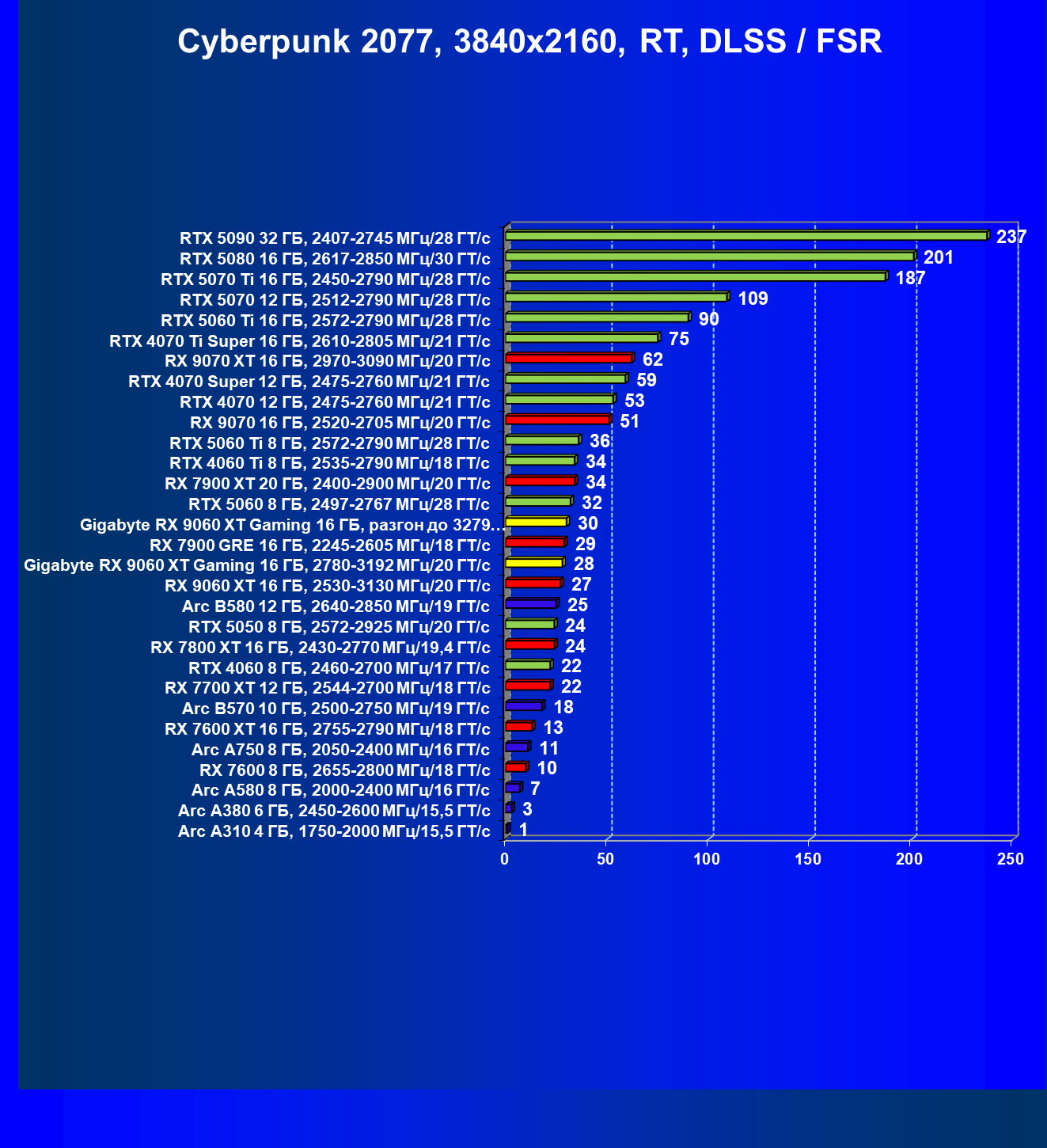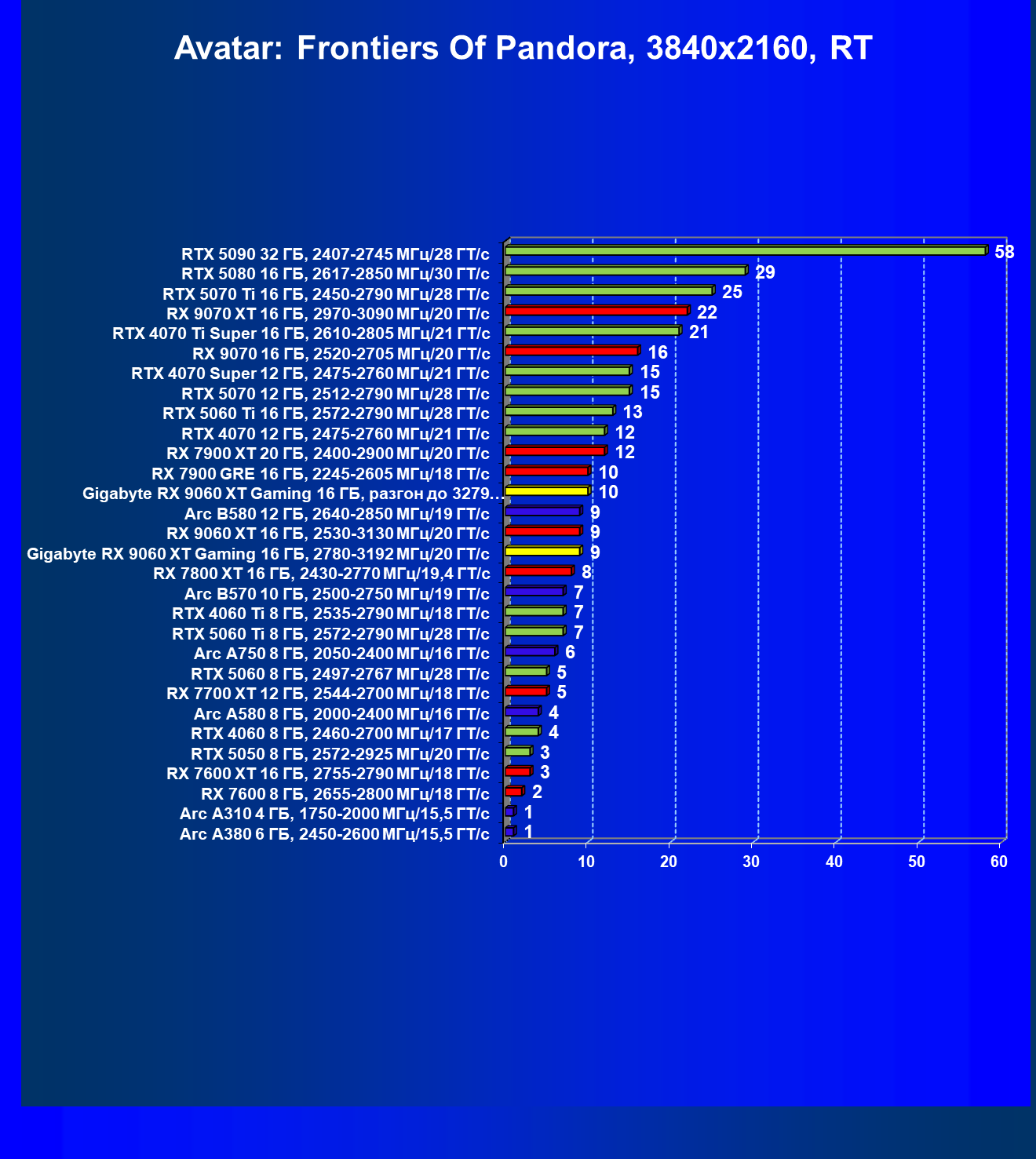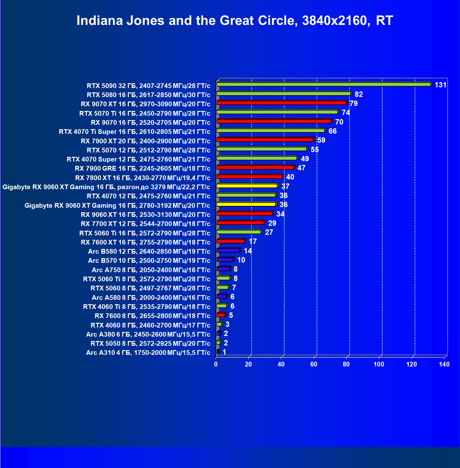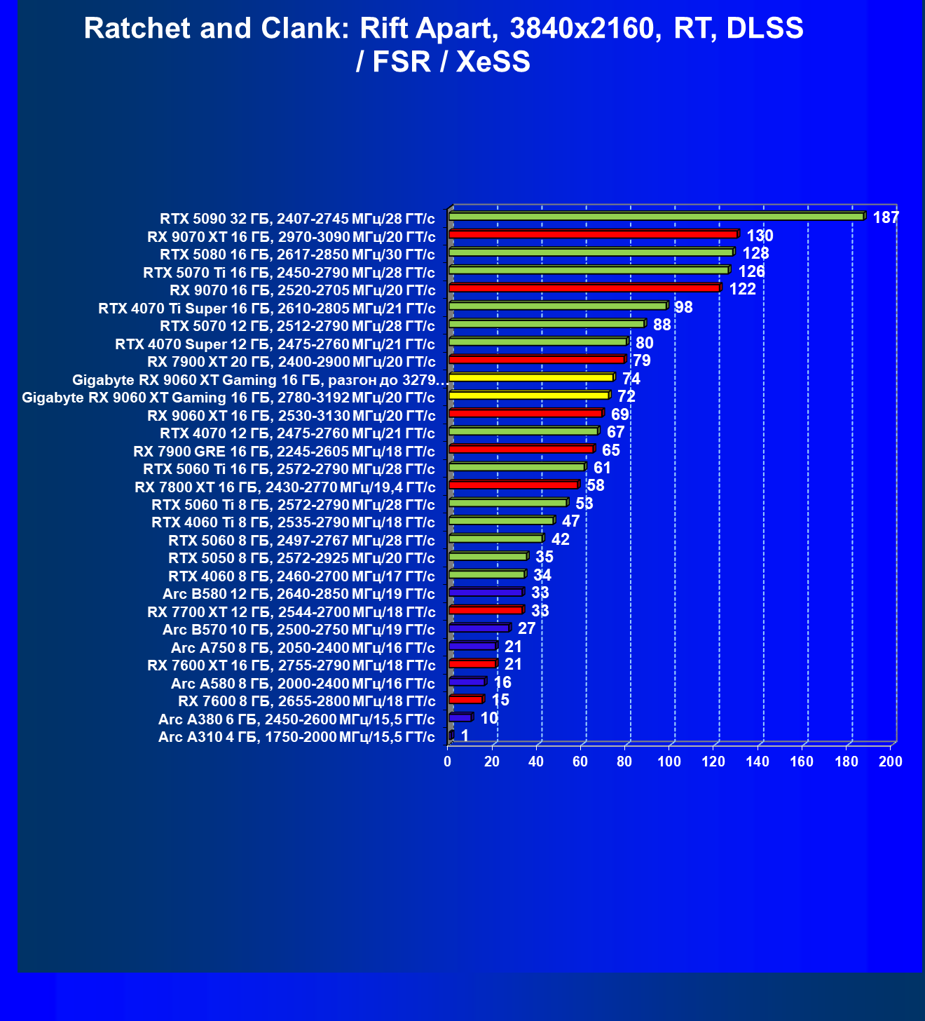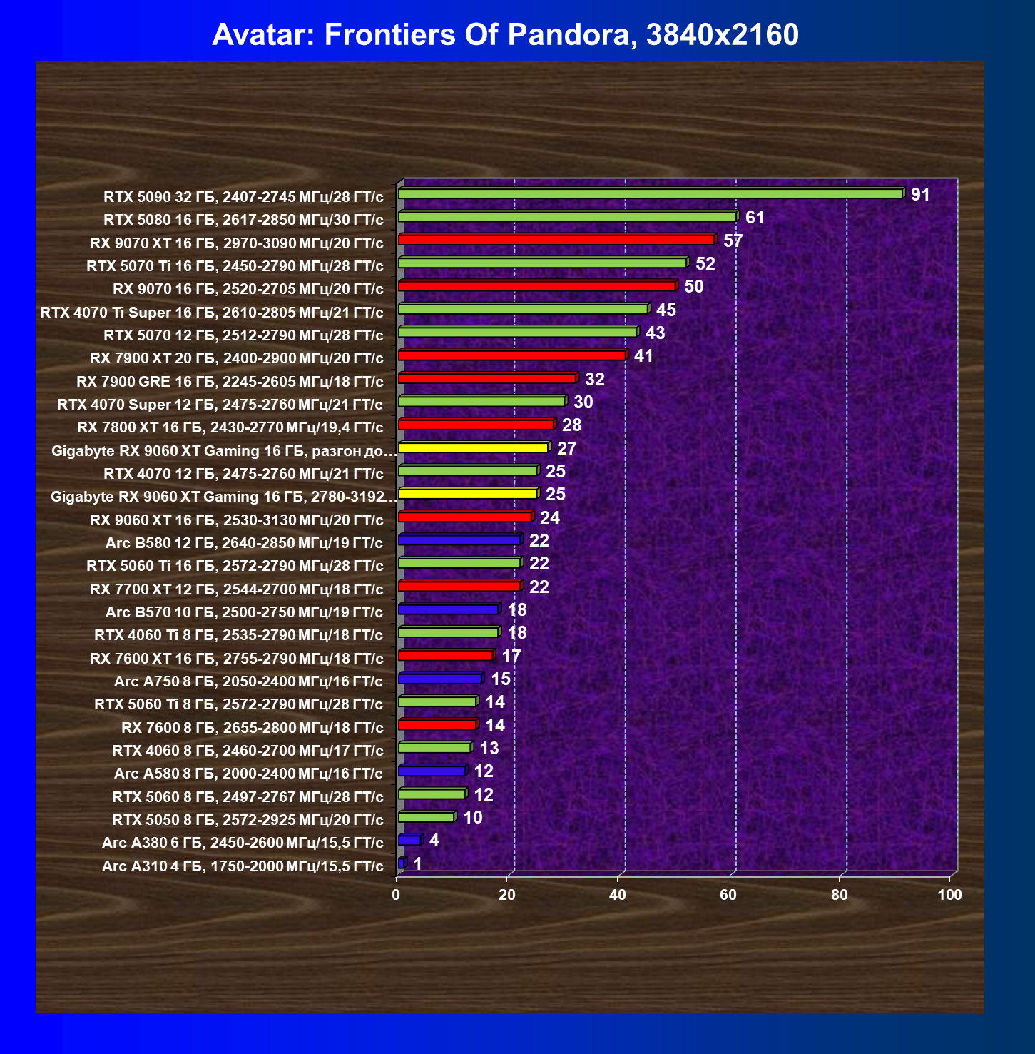 | 07 | Gigabyte RX 9060 XT Gaming 16 ГБ, разгон до 3279 МГц/22,2 ГТ/с | 581 | 2616 | 45 000 |
