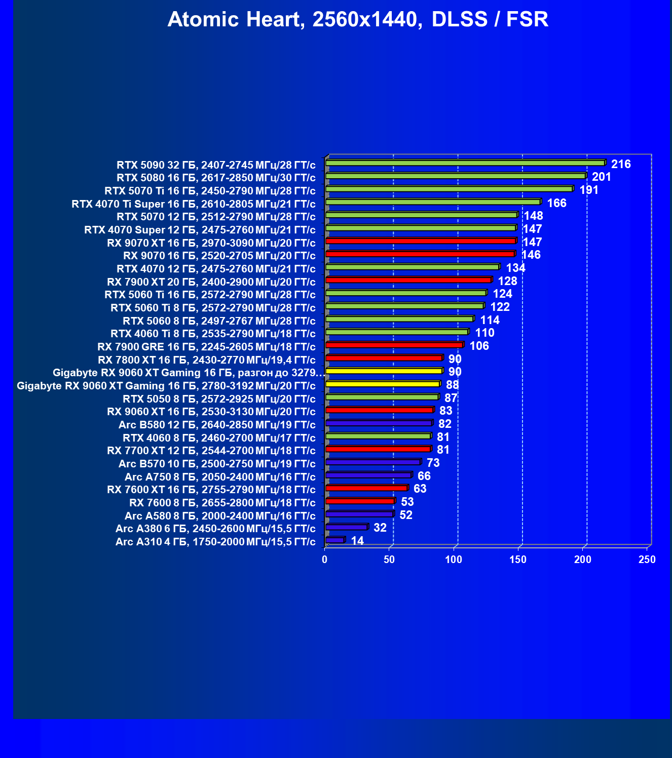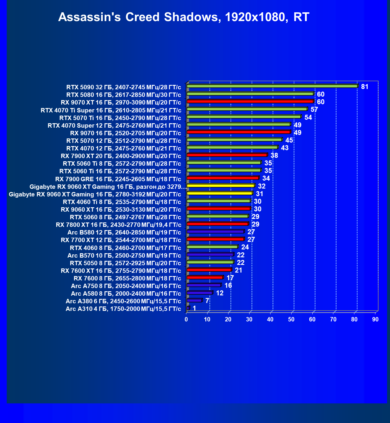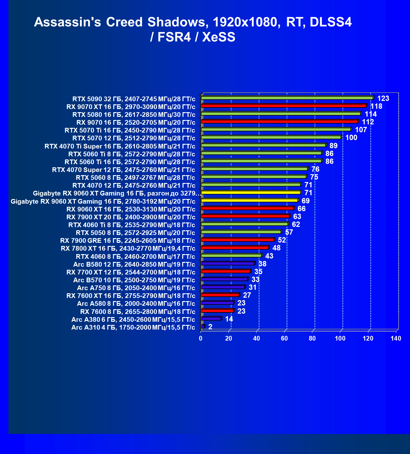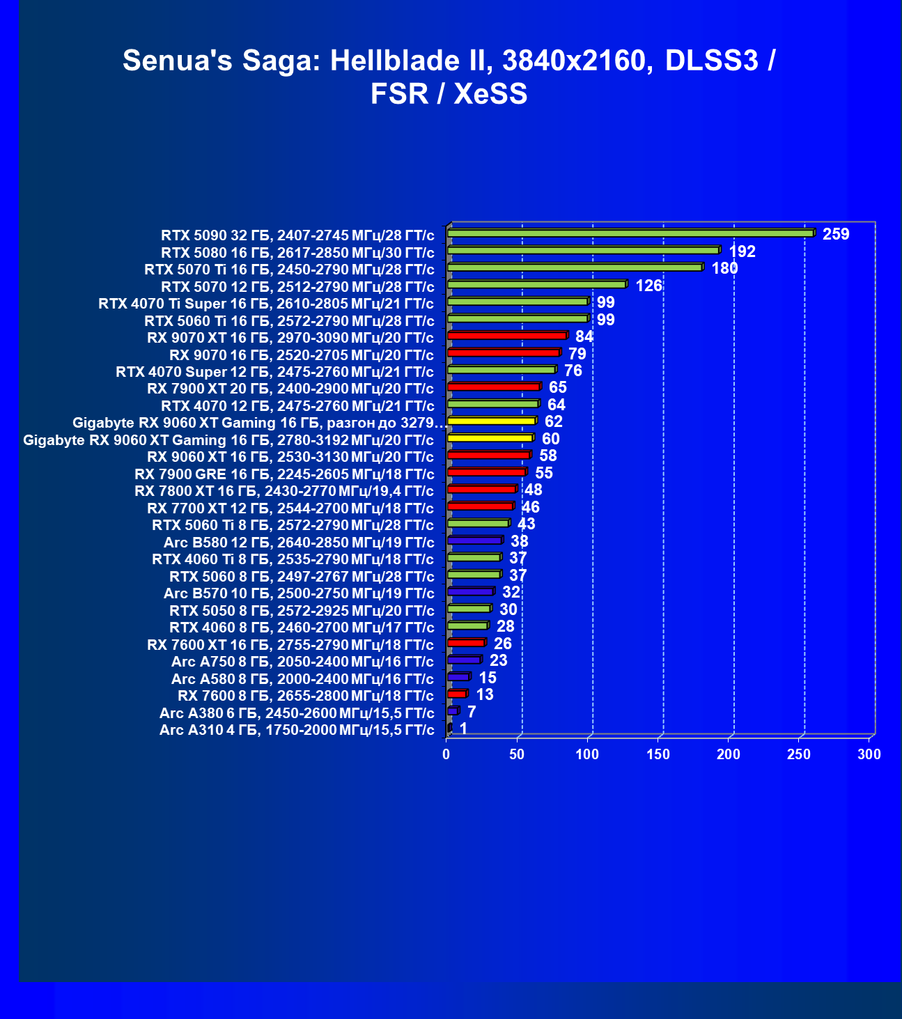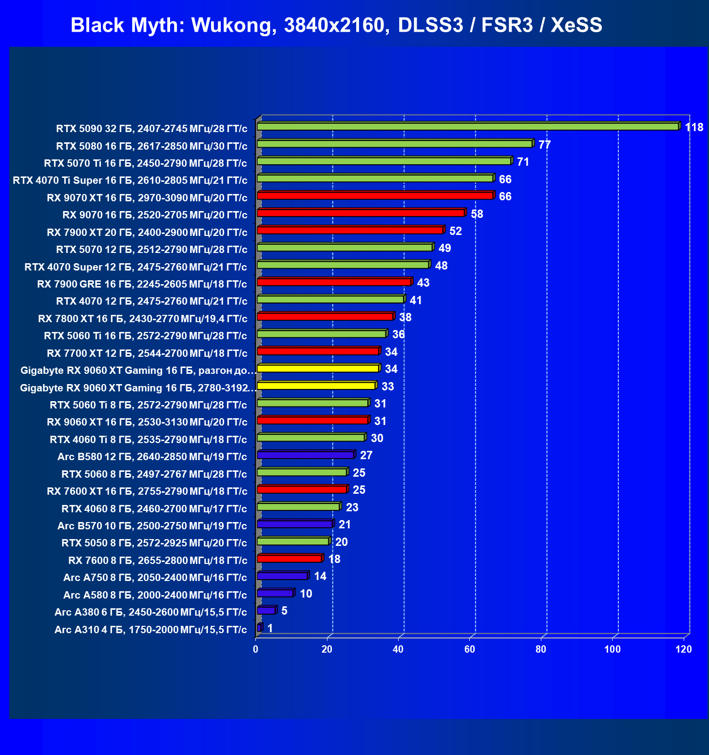 | 07 | Gigabyte RX 9060 XT Gaming 16 ГБ, разгон до 3279 МГц/22,2 ГТ/с | 581 | 2616 | 45 000 |