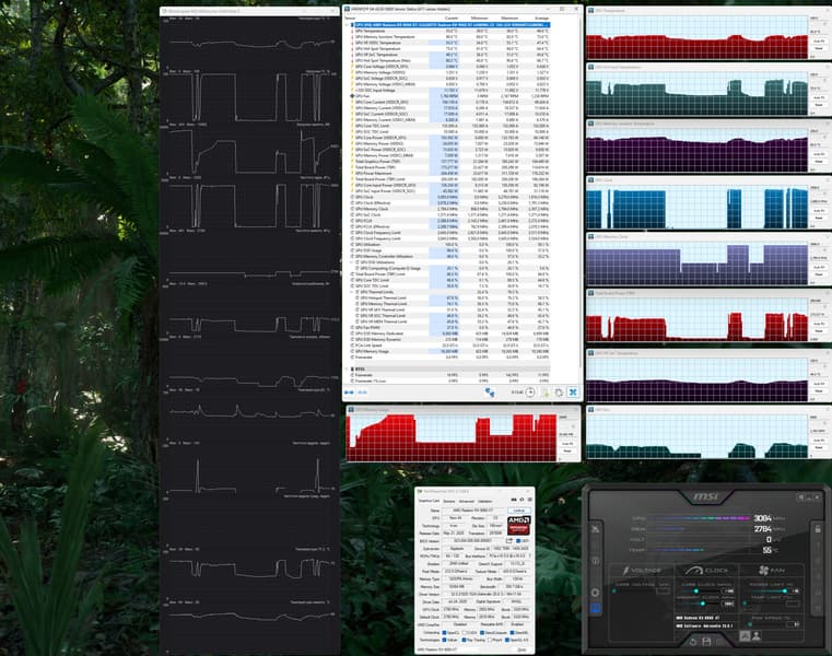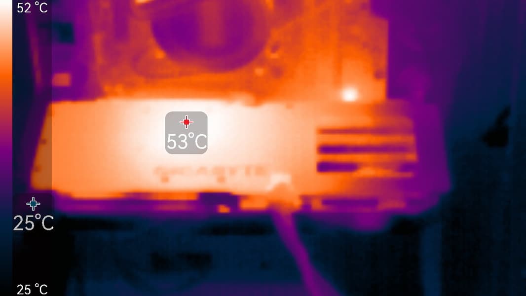 После прогона под нагрузкой максимальная температура ядра не превысила 55 градусов (hot spot — 82 °C), а микросхем памяти — 82 °C, что является отличным результатом. Энергопотребление карты доходило до 182 Вт.