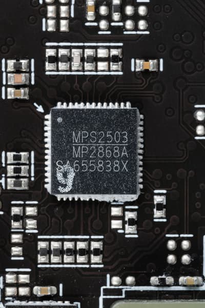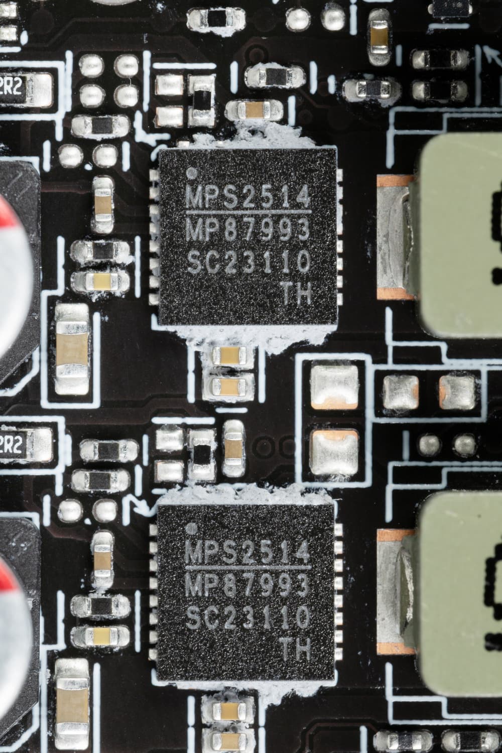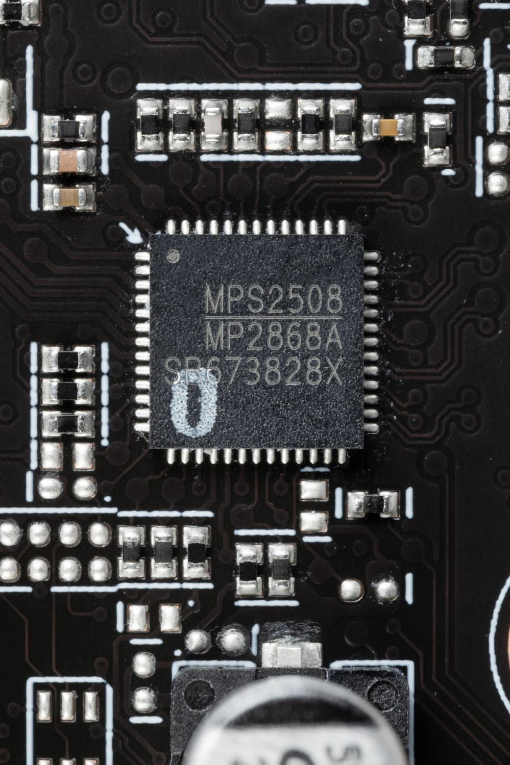 У карты имеется два ШИМ-контроллера Monolithic Power Systems MP2868, они работают в паре и управляют обеими схемами питания.