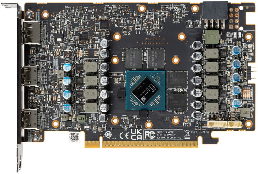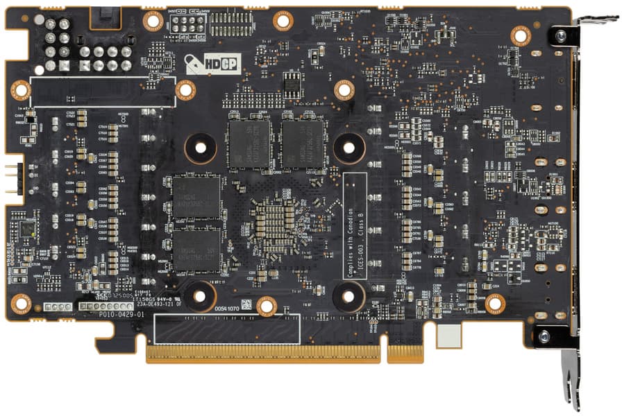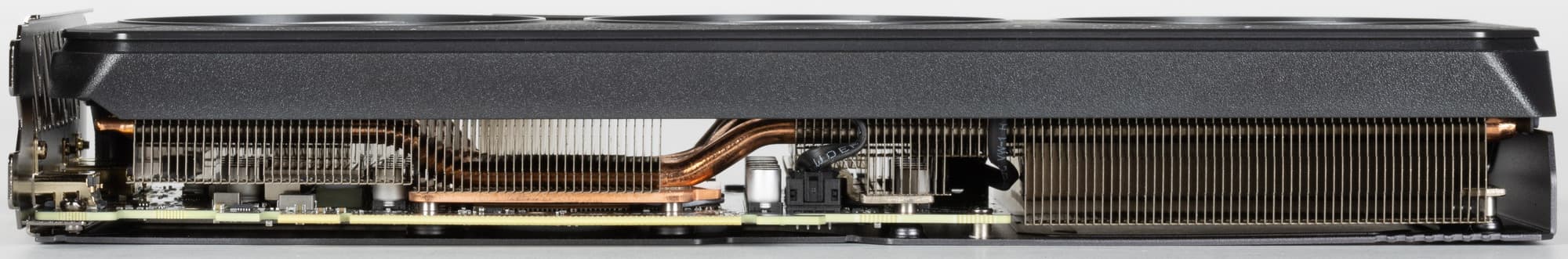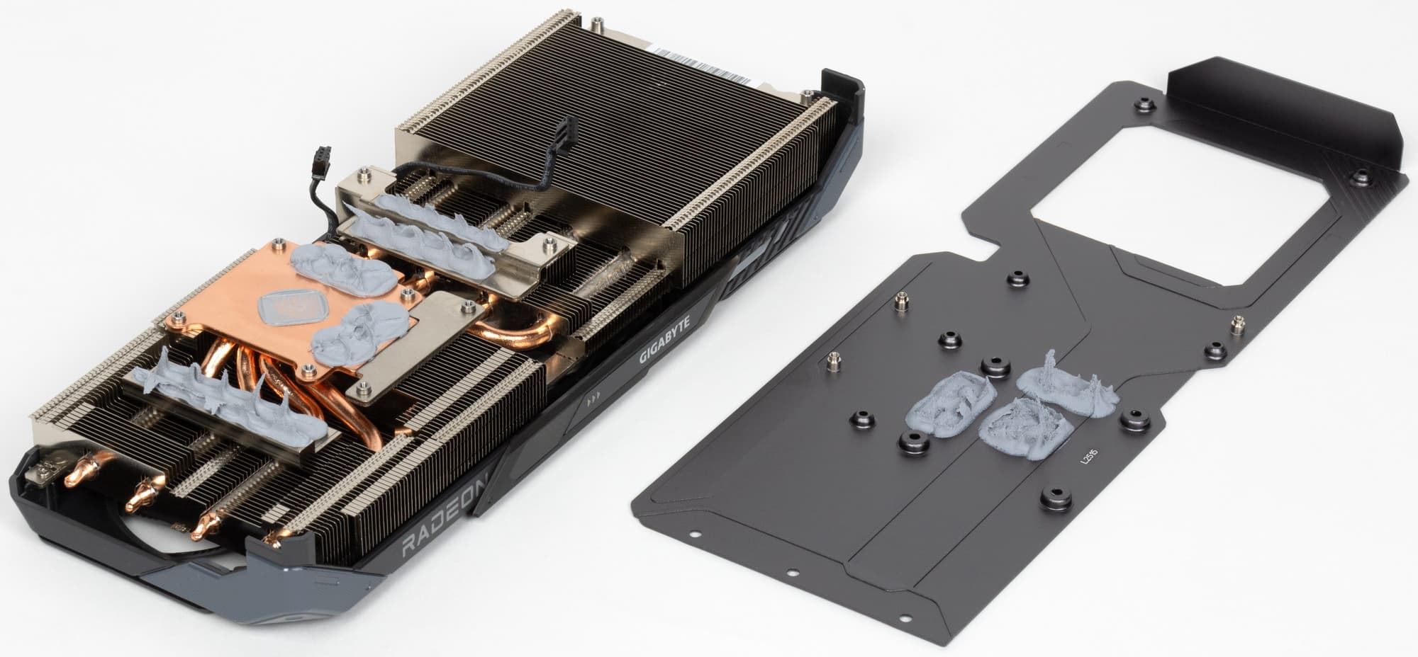 Для охлаждения преобразователей питания VRM имеются свои подошвы на радиаторе. Задняя пластина служит не только элементом защиты PCB, но и участвует в охлаждении микросхем памяти на оборотной стороне карты (через тот же теплопроводящий гель).