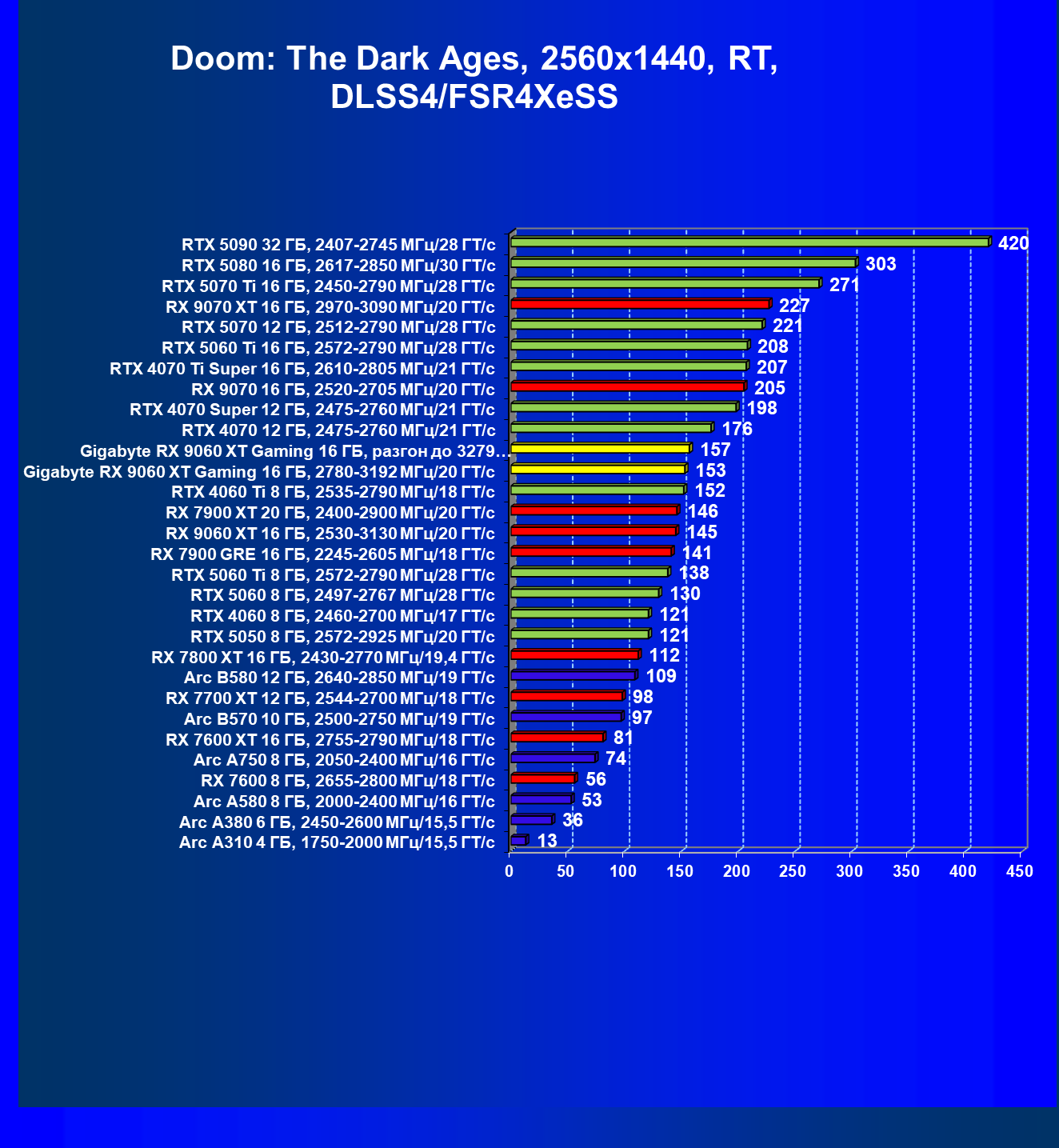 | 13 | Gigabyte RX 9060 XT Gaming 16 ГБ, разгон до 3279 МГц/22,2 ГТ/с | 1421 | 316 | 45 000 |