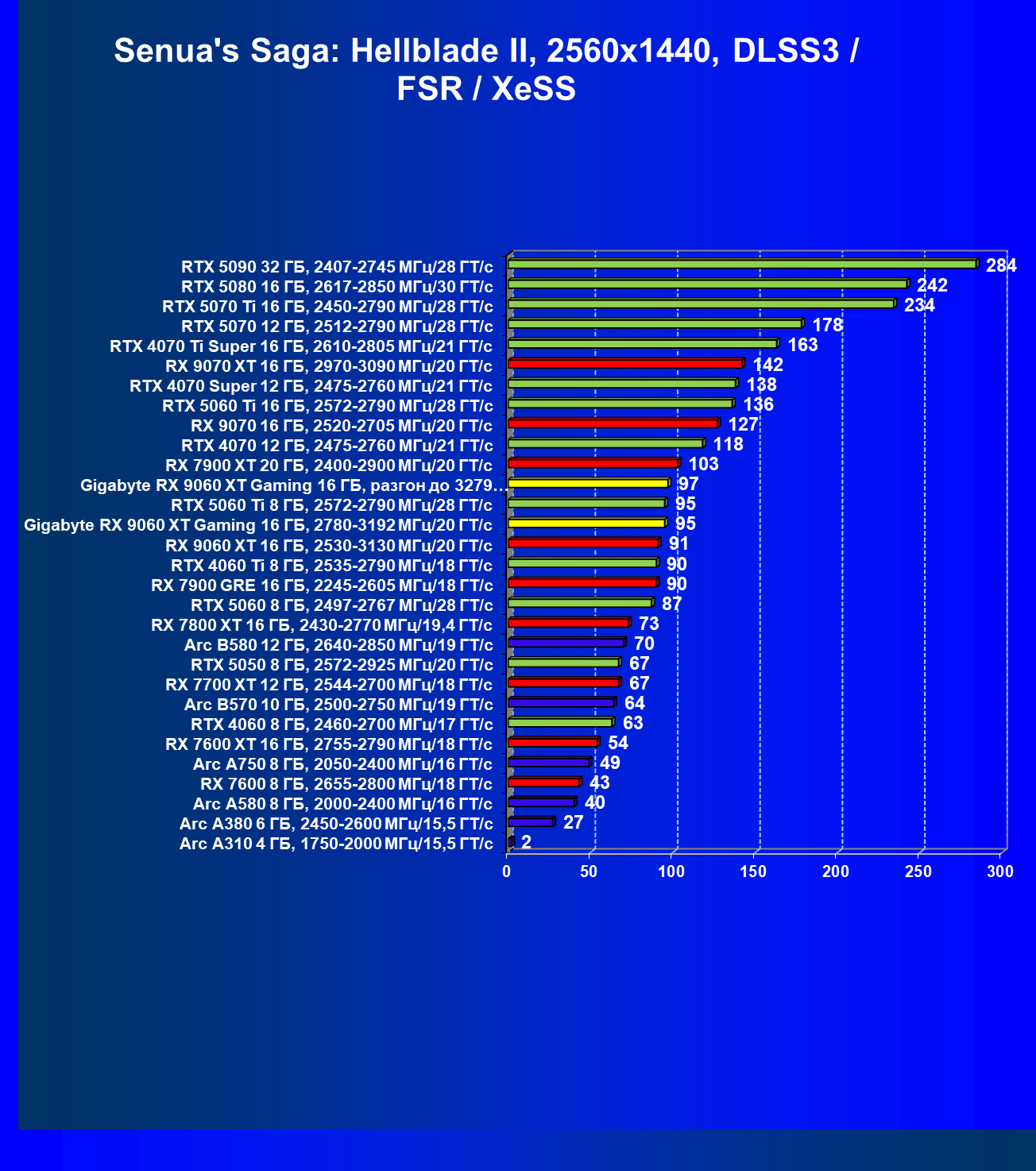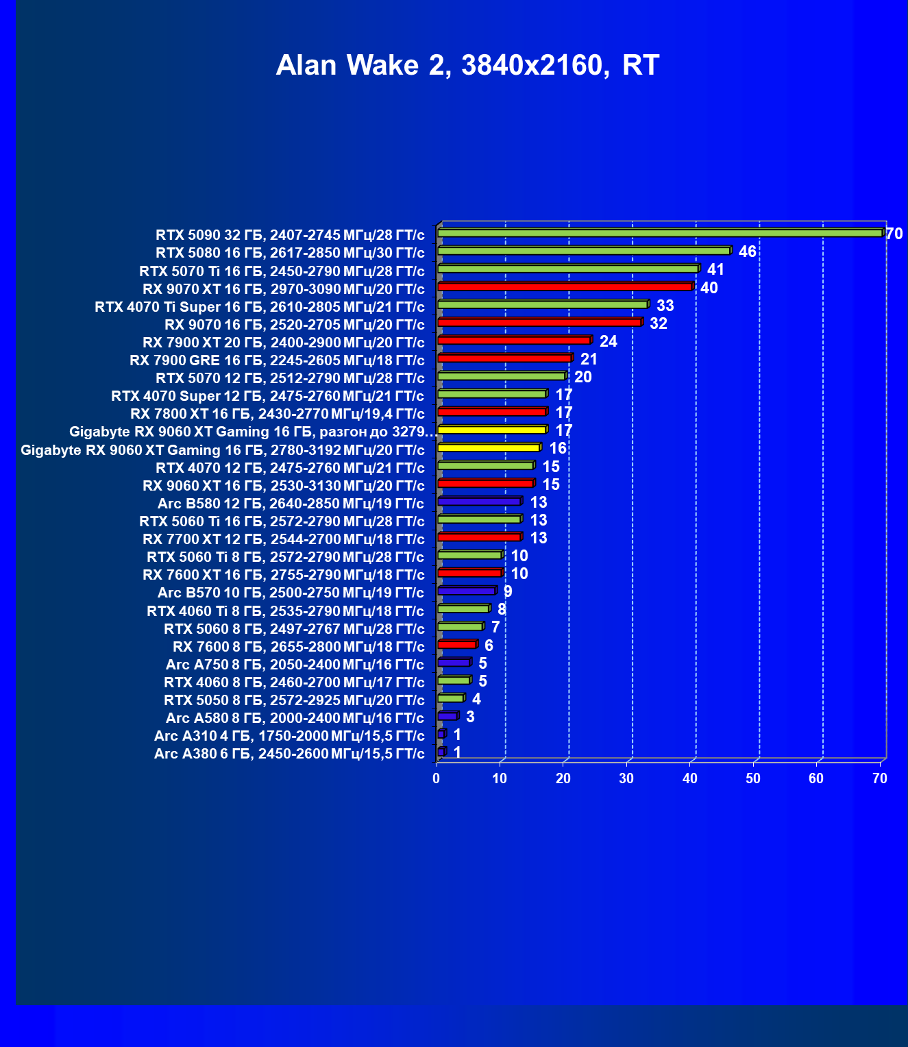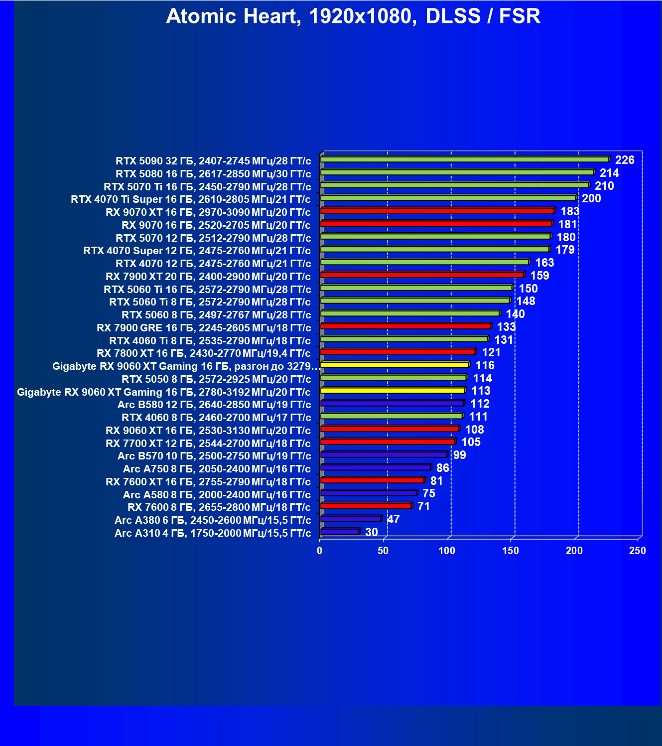 | 07 | Gigabyte RX 9060 XT Gaming 16 ГБ, разгон до 3279 МГц/22,2 ГТ/с | 316 | 1421 | 45 000 |