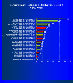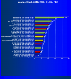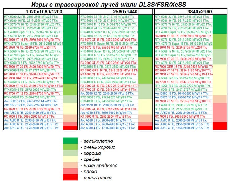 - Результаты тестов со включенной аппаратной трассировкой лучей и/или DLSS/FSR/XeSS в разрешениях 1920×1080, 2560×1440 и 3840×2160