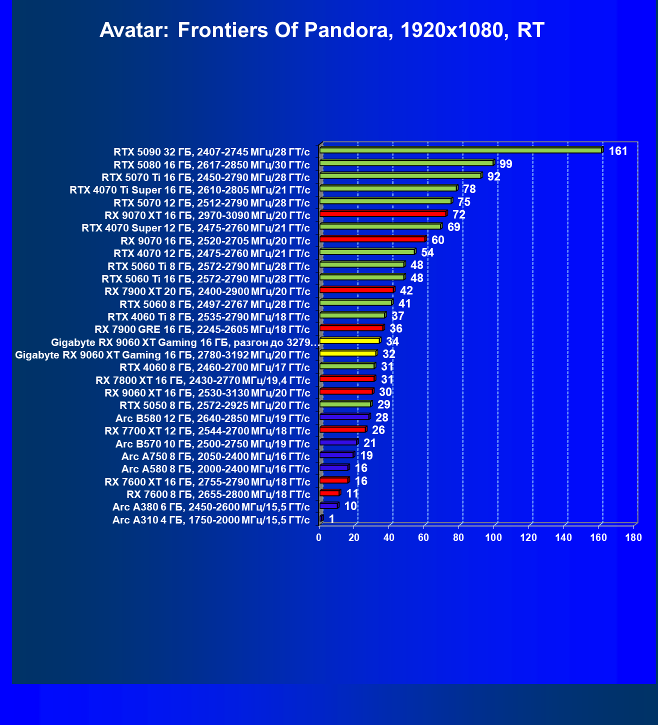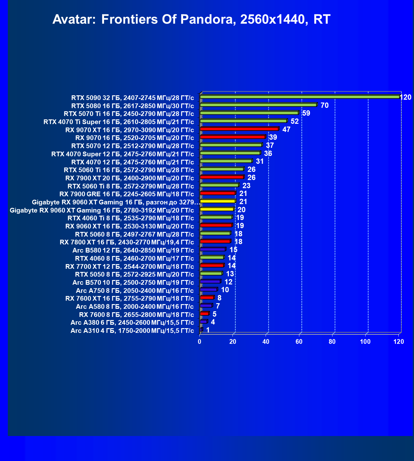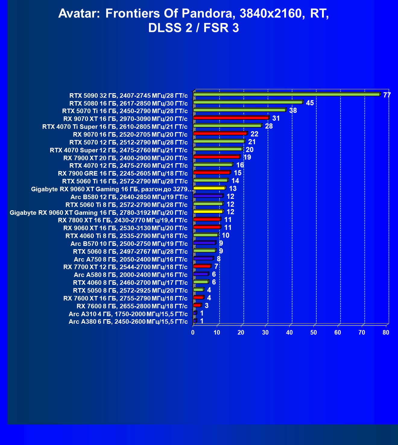 | 12 | Gigabyte RX 9060 XT Gaming 16 ГБ, разгон до 3279 МГц/22,2 ГТ/с | 2616 | 581 | 45 000 |