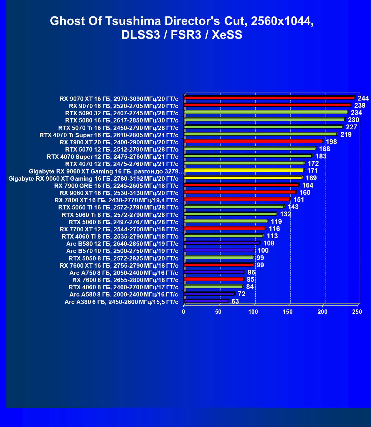 В данном случае ситуация уже несколько иная: вариант RTX 5060 Ti с 16 ГБ резко вышел вперед (понятно, что за счет поддержки и эффективного использования MFG в рамках DLSS4), и RX 9060 XT (16 ГБ) смог продемонстрировать в среднем производительность на уровне уже RTX 5060 Ti с 8 ГБ (который чуть дешевле). Остальные выводы аналогичным предыдущим.