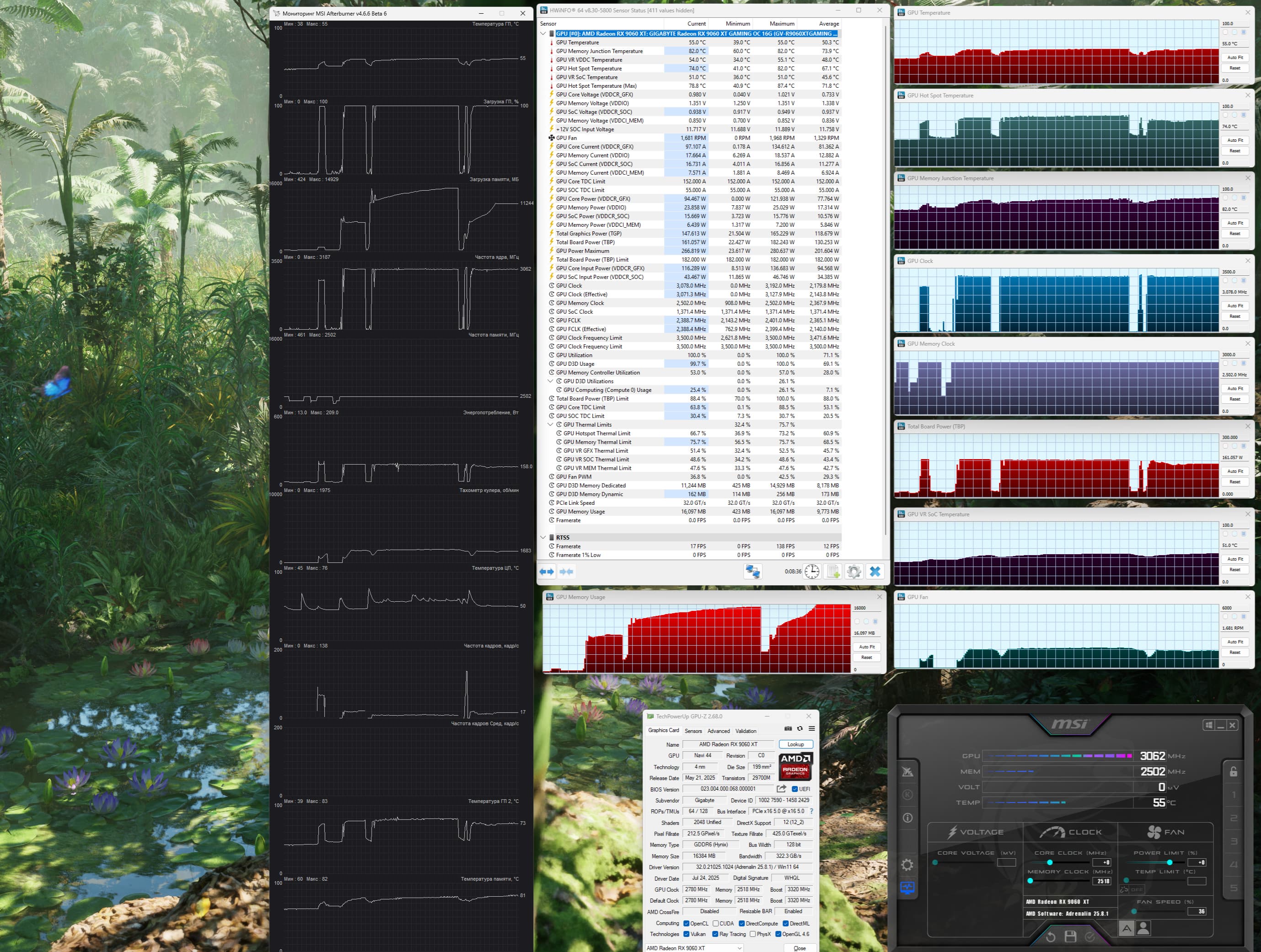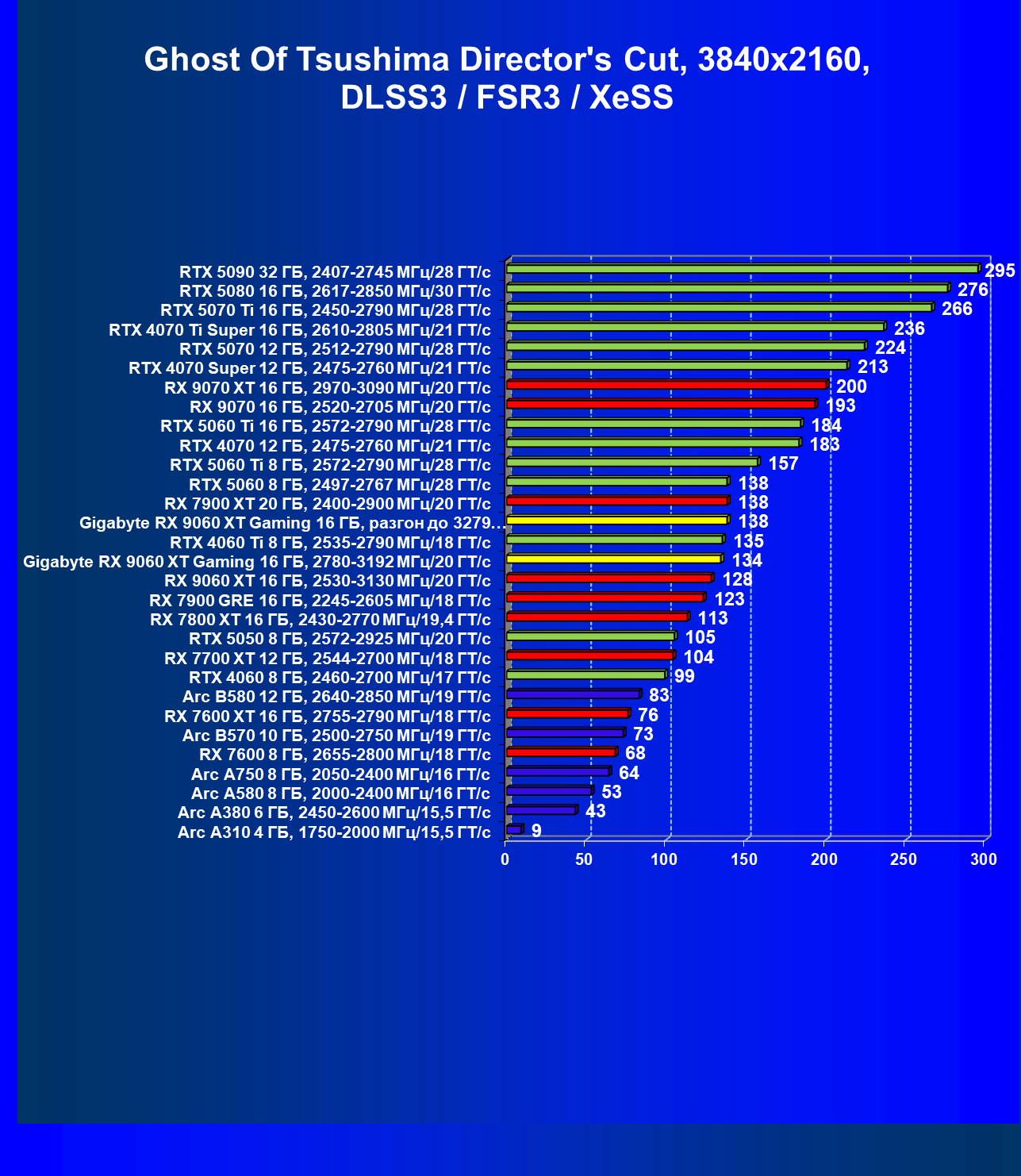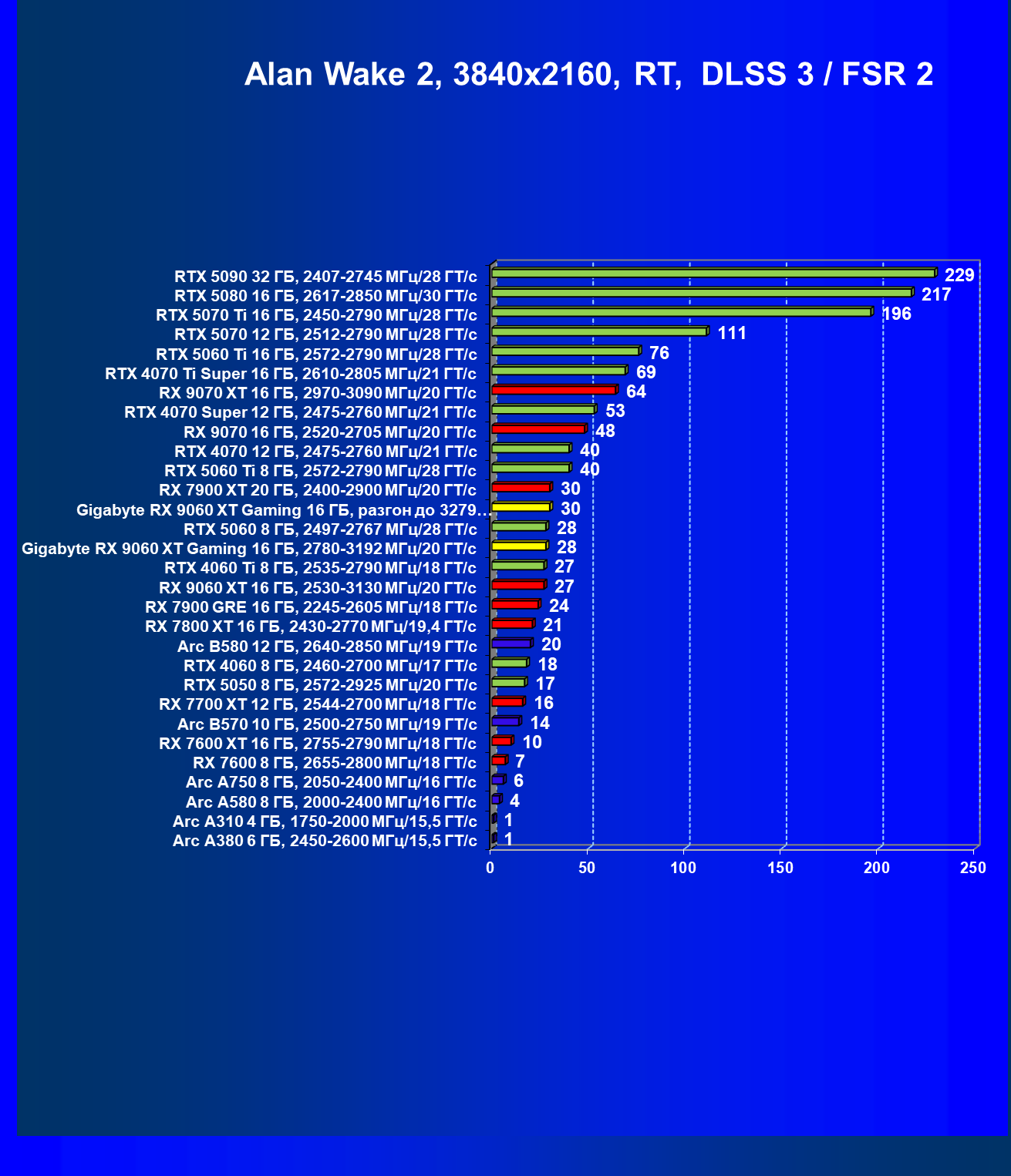 | 10 | RX 9060 XT 16 ГБ, 2530—3130 МГц/20 ГТ/с | 289 | 1302 | 45 000 |