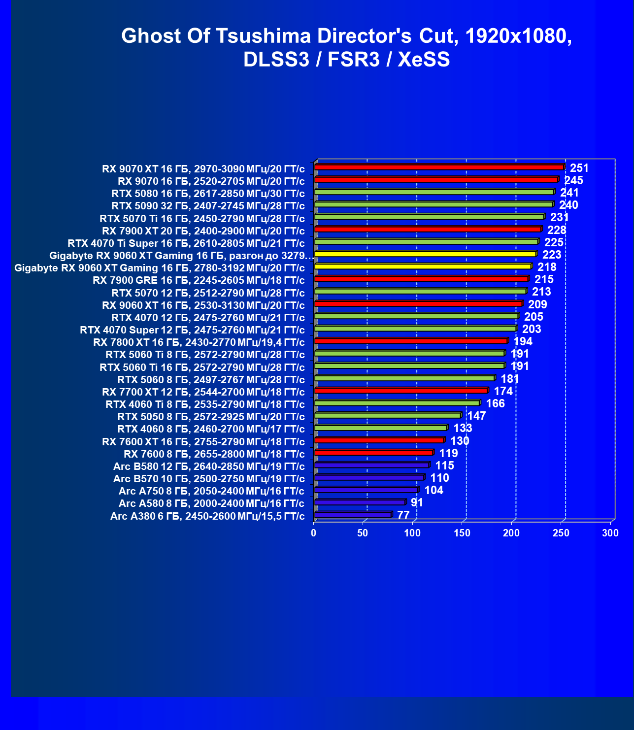 | 21 | RX 7700 XT 12 ГБ, 2544—2700 МГц/18 ГТ/с | 309 | 1789 | 58 000 |