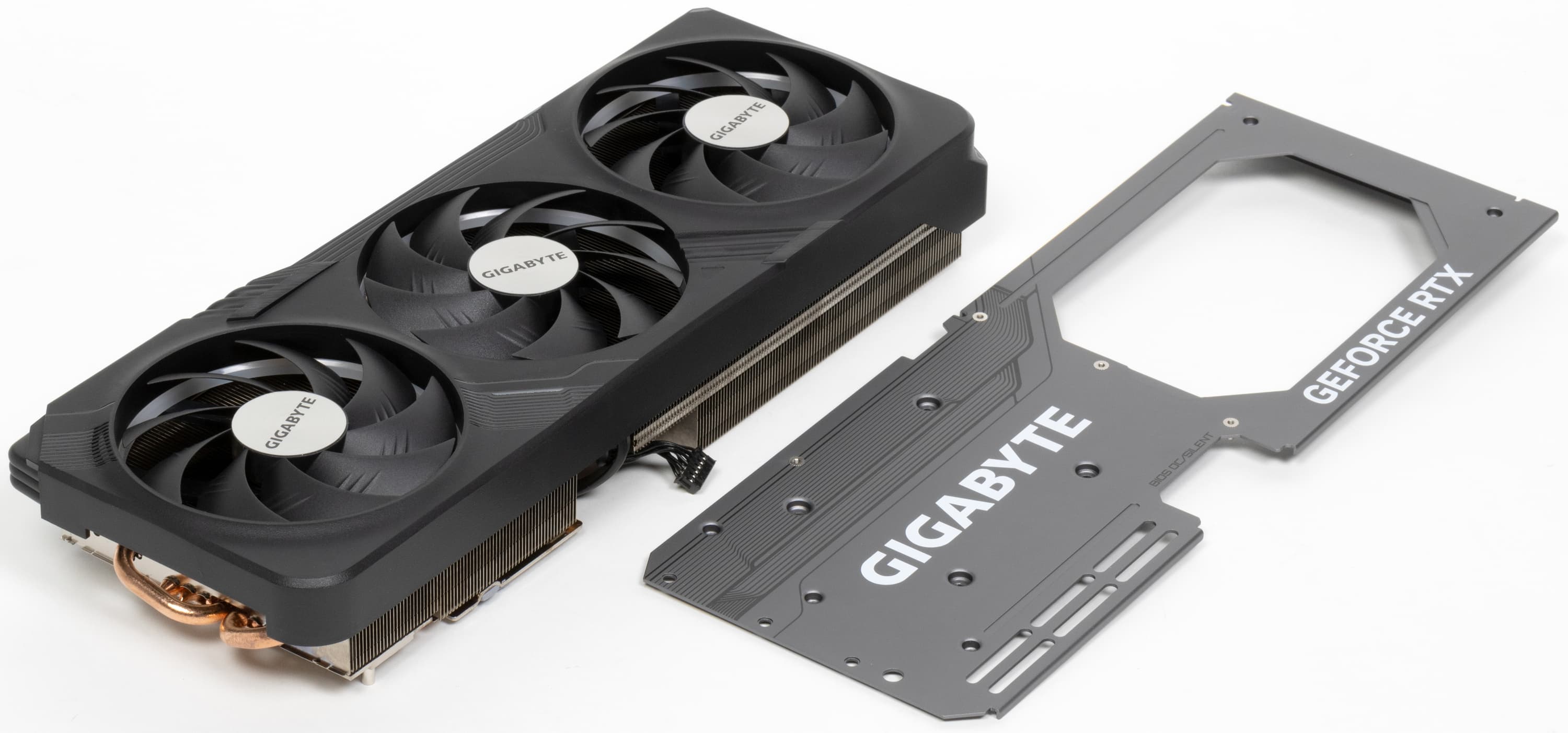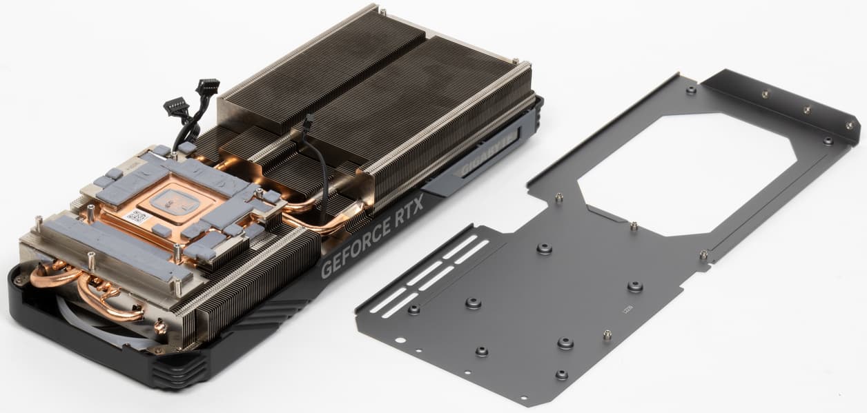 Система охлаждения продувается насквозь крайним вентилятором. У карты Gigabyte основой кулера является огромный многосекционный пластинчатый никелированный радиатор с тепловыми трубками, распределяющими тепло по ребрам радиатора, что на деле демонстрирует высокую эффективность теплоотвода от горячих компонентов. Трубки припаяны к огромной медной подошве, под которой скрывается испарительная камера.