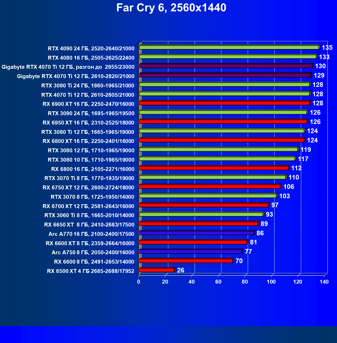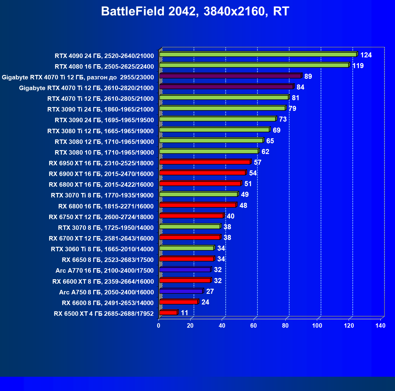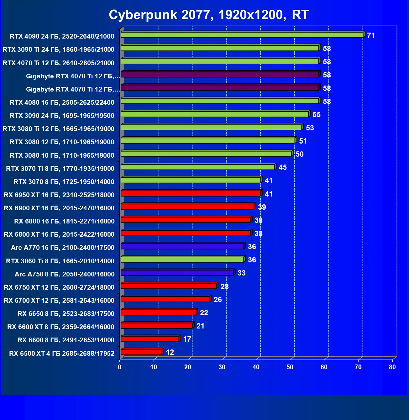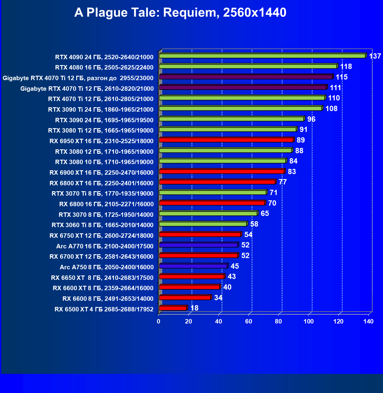 | 18 | Gigabyte RTX 4070 Ti Gaming OC 12 ГБ, 2610—2820/21000 | 56 | 472 | 84 000 |