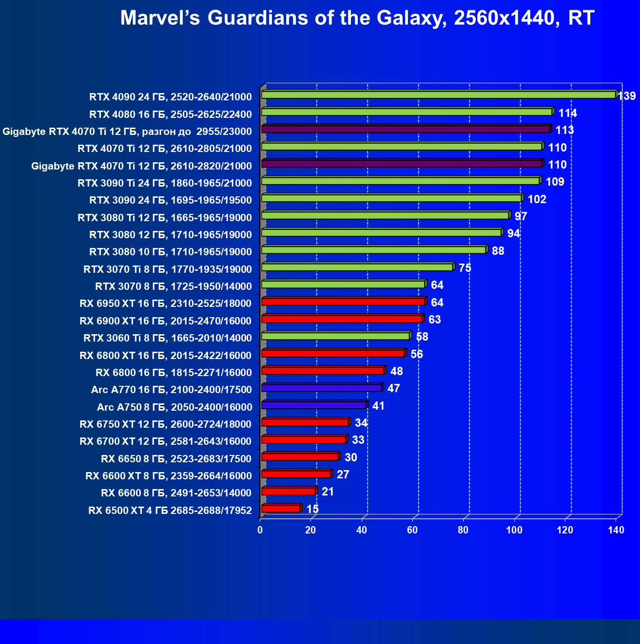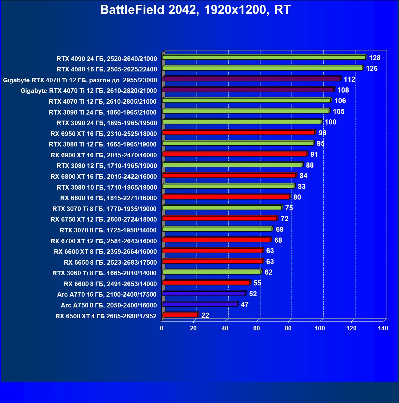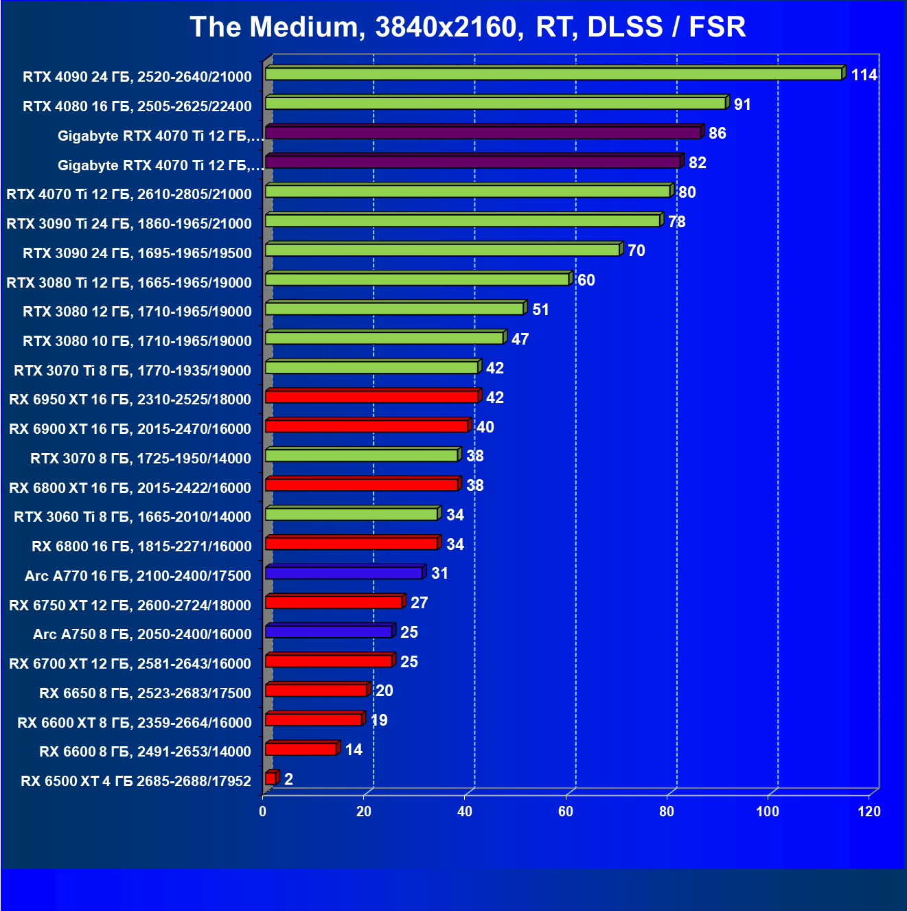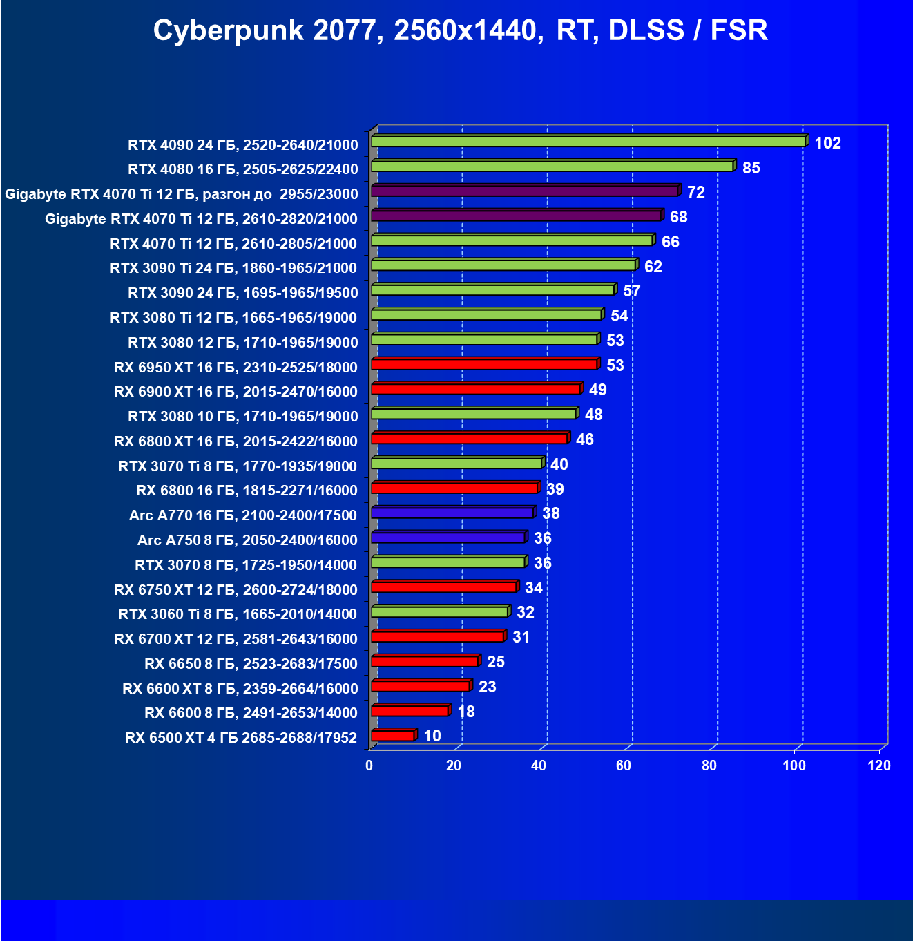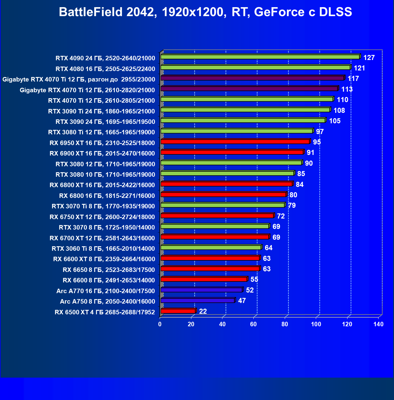 | 18 | Gigabyte RTX 4070 Ti Gaming OC 12 ГБ, 2610—2820/21000 | 56 | 472 | 84 000 |