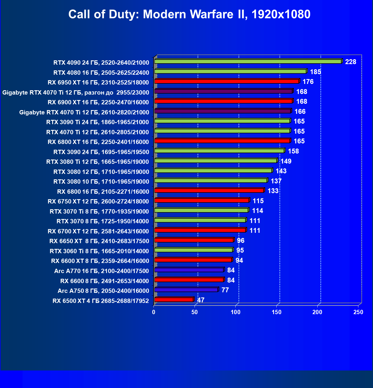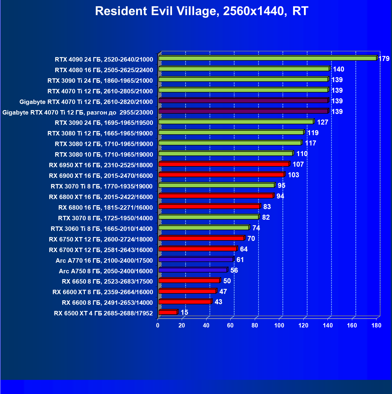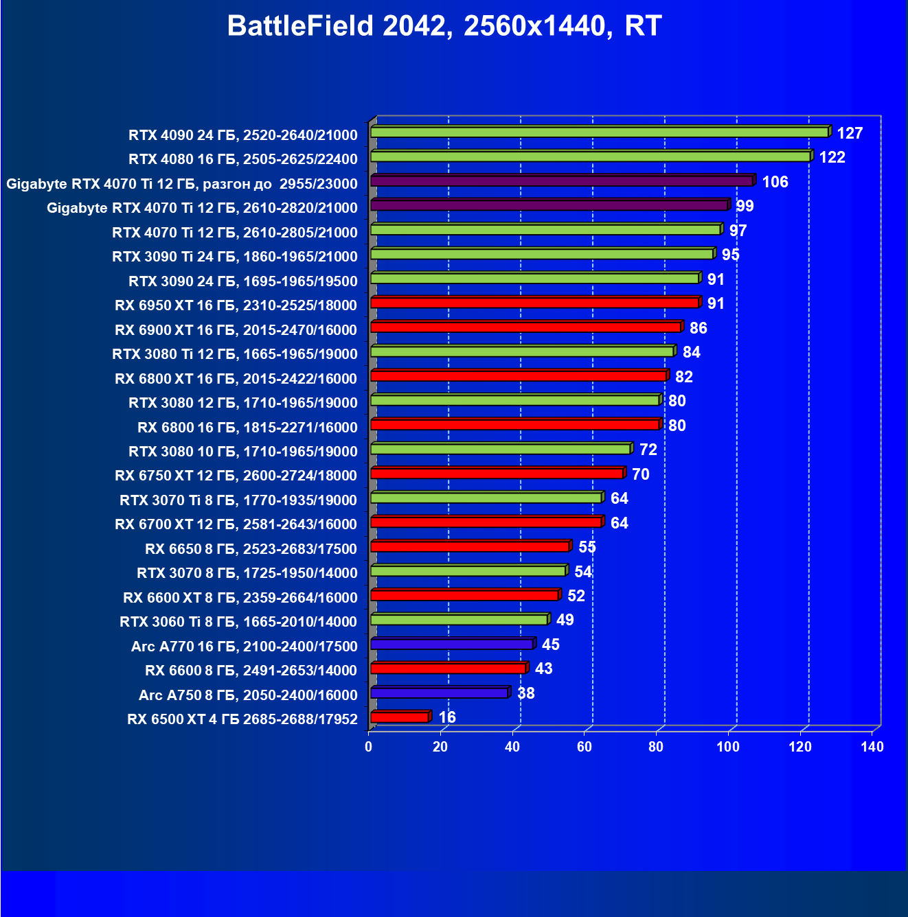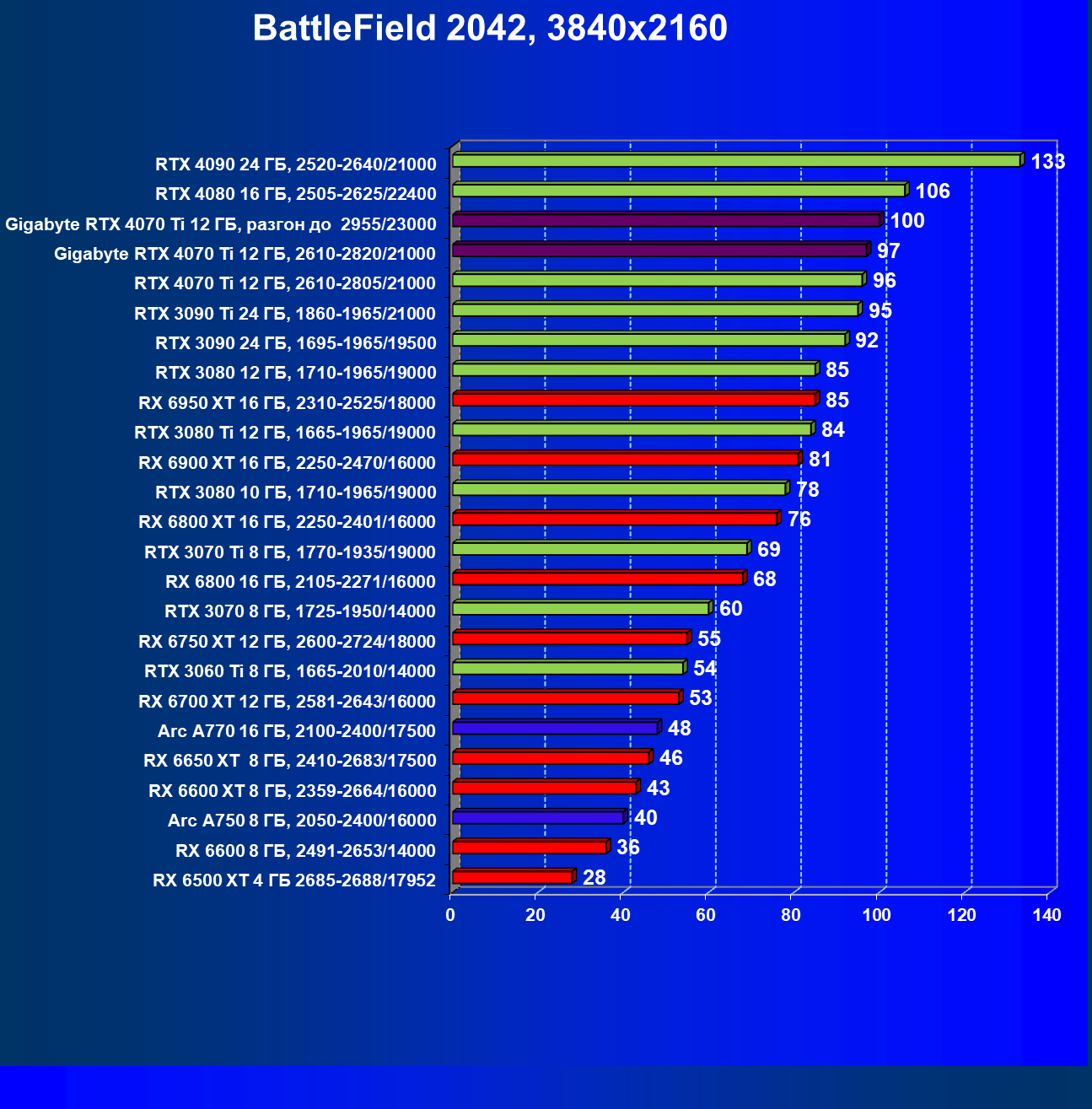 | 18 | Gigabyte RTX 4070 Ti Gaming OC 12 ГБ, 2610—2820/21000 | 56 | 472 | 84 000 |