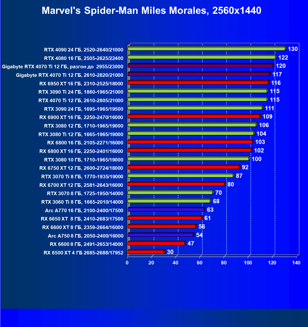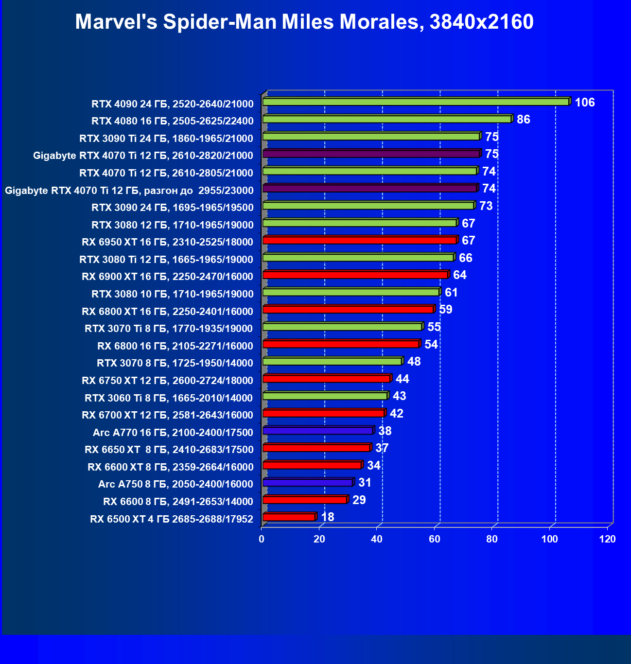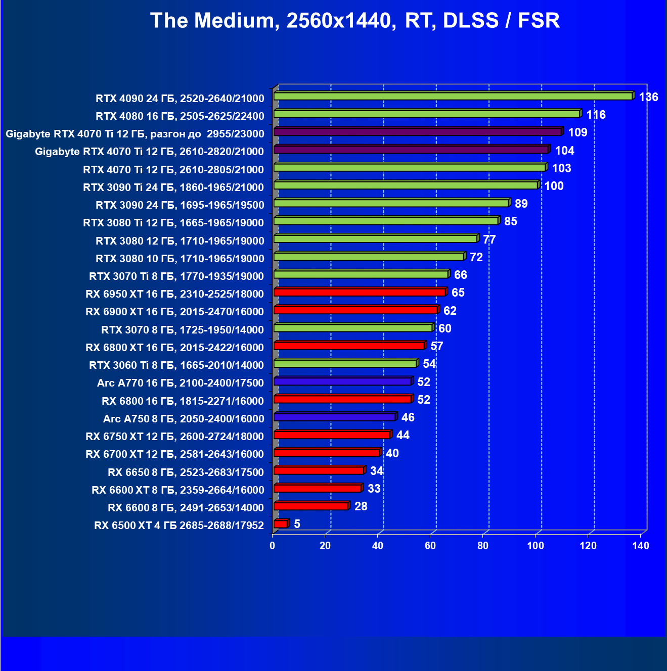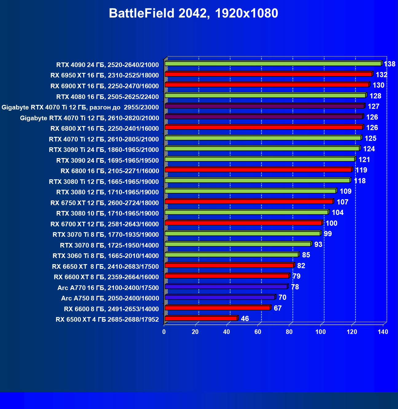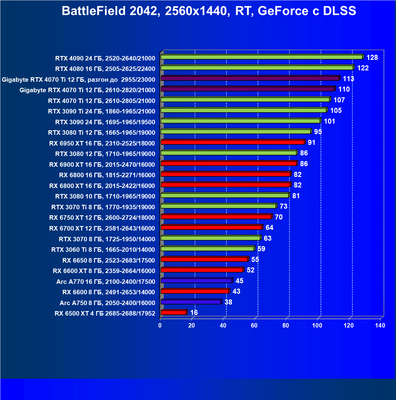 | 18 | Gigabyte RTX 4070 Ti Gaming OC 12 ГБ, 2610—2820/21000 | 56 | 472 | 84 000 |