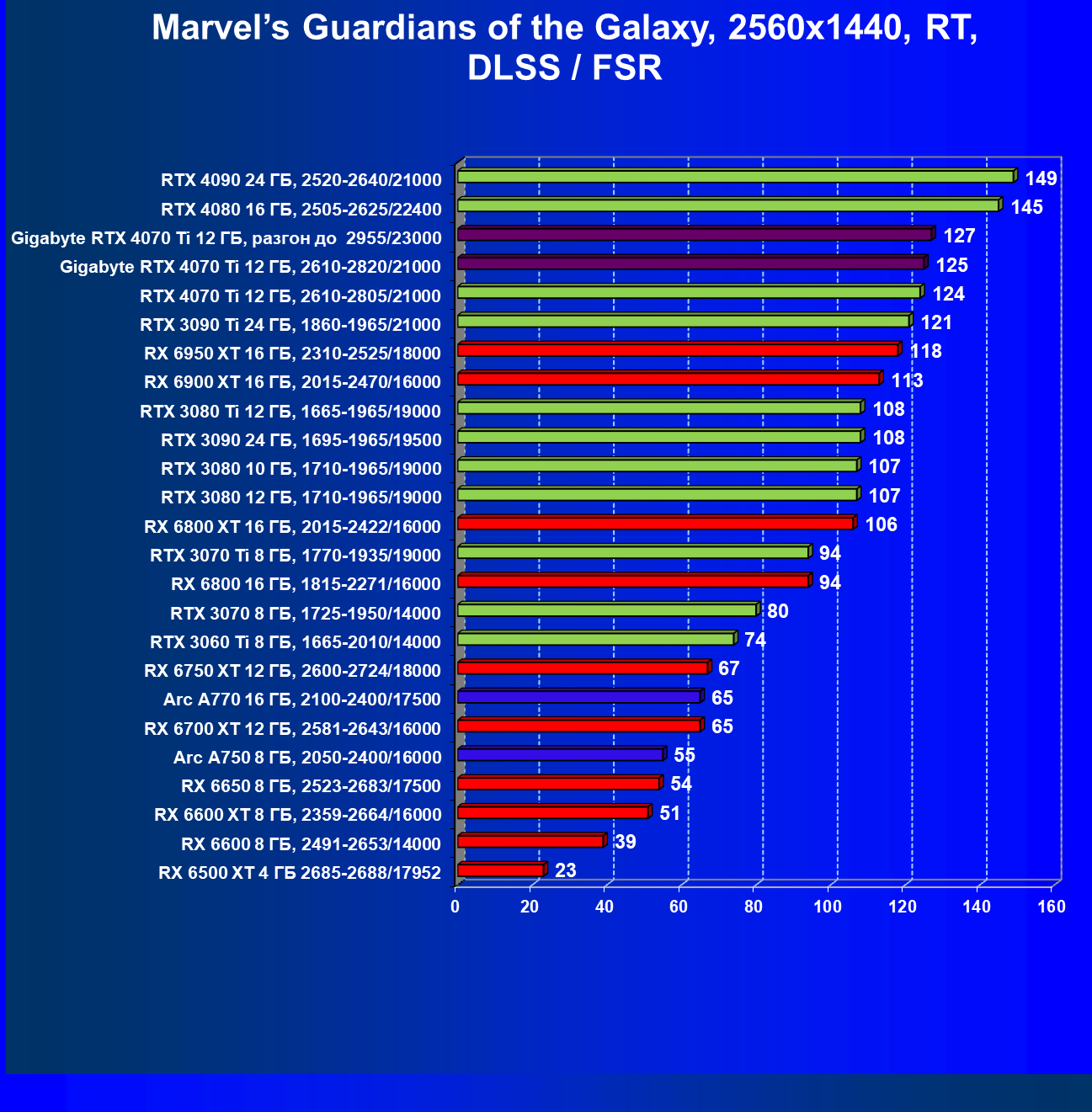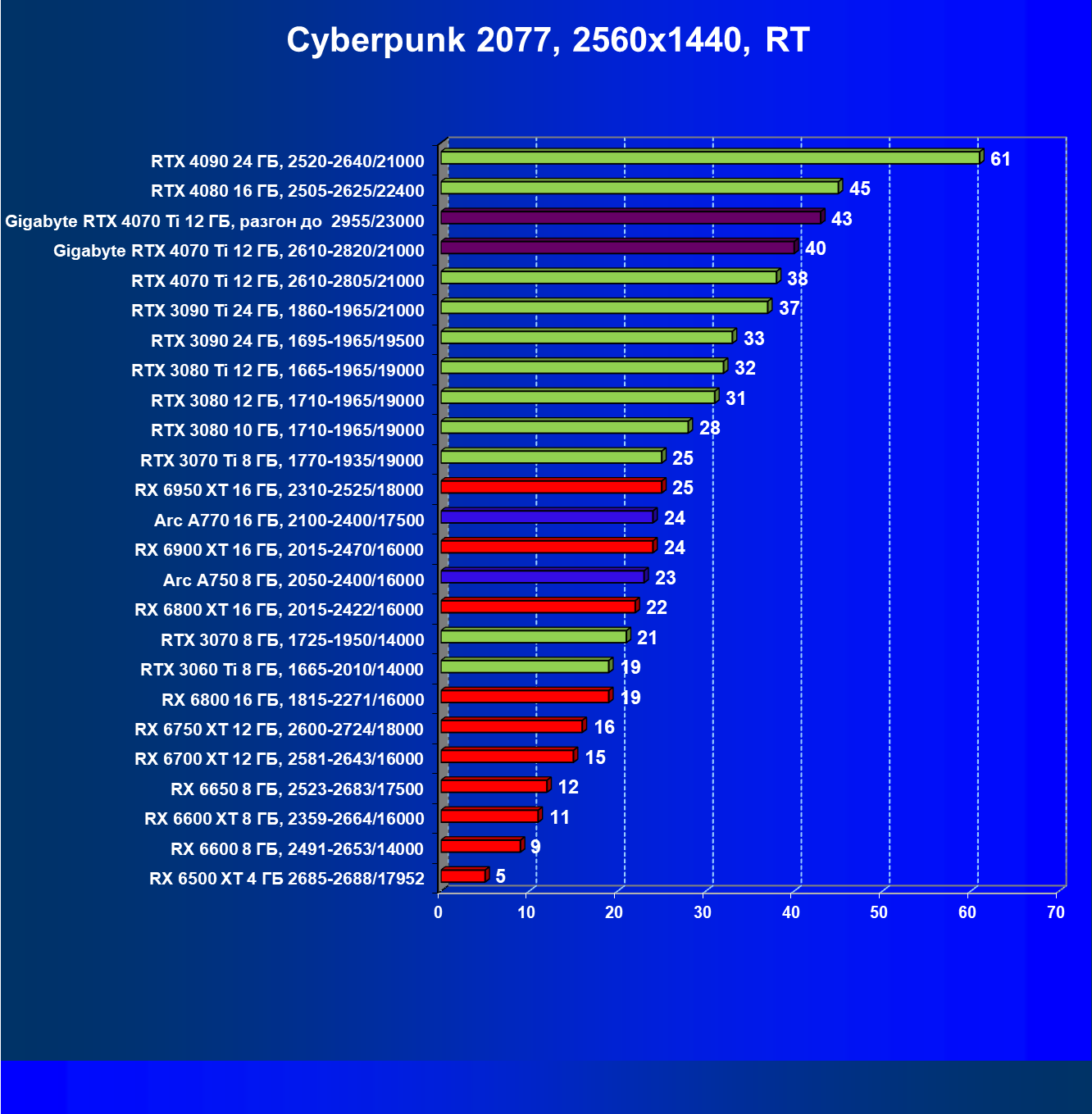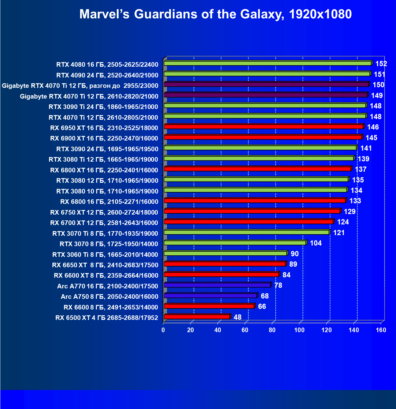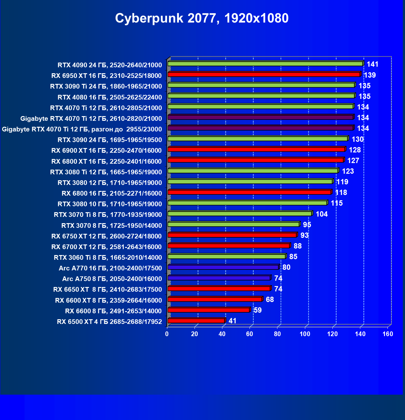 | 02 | Gigabyte RTX 4070 Ti Gaming OC 12 ГБ, разгон до 2955/23000 | 157 | 1321 | 84 000 |