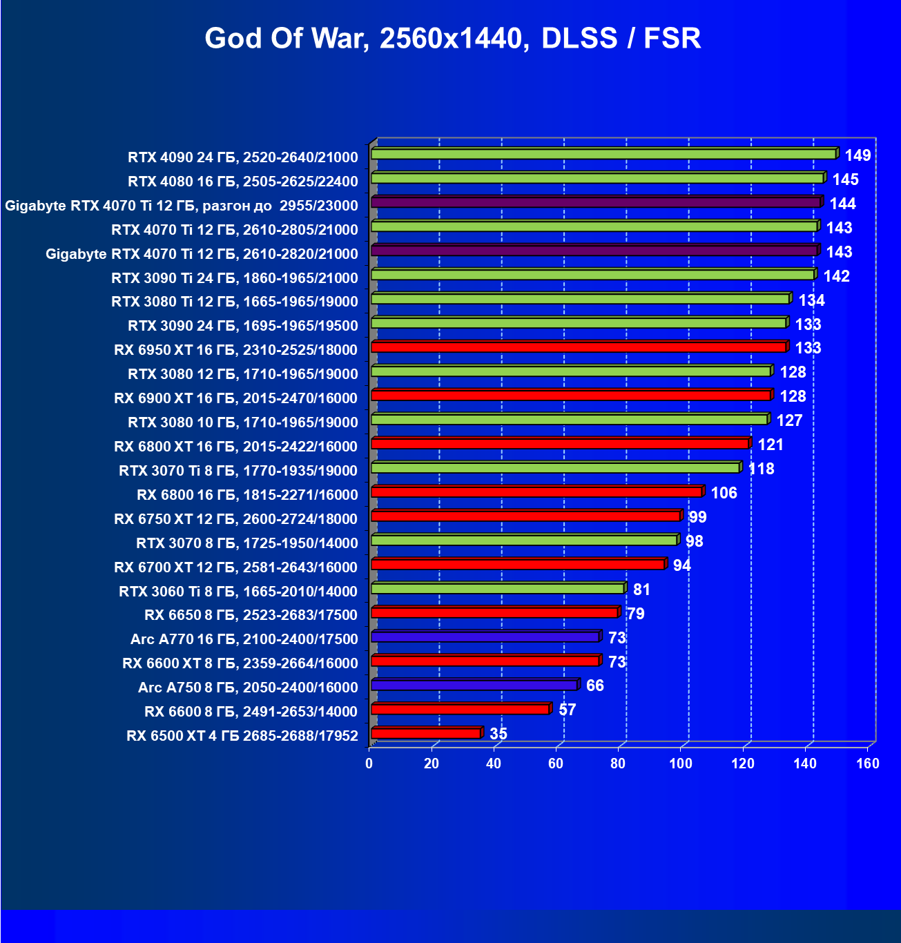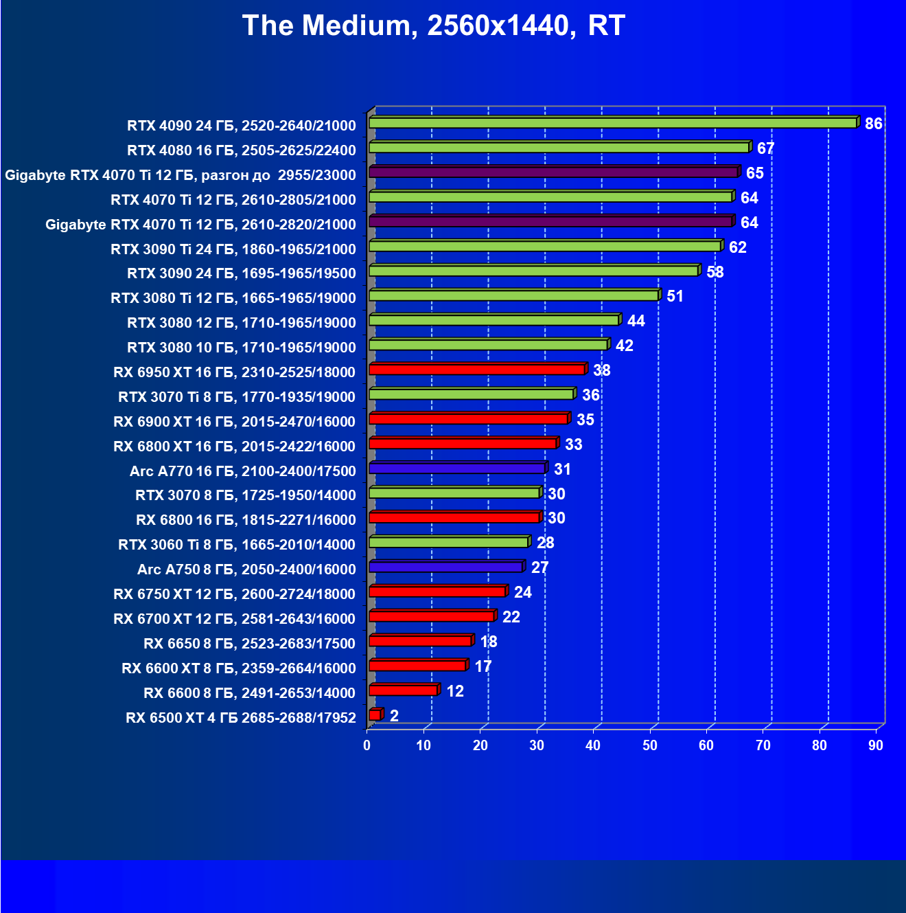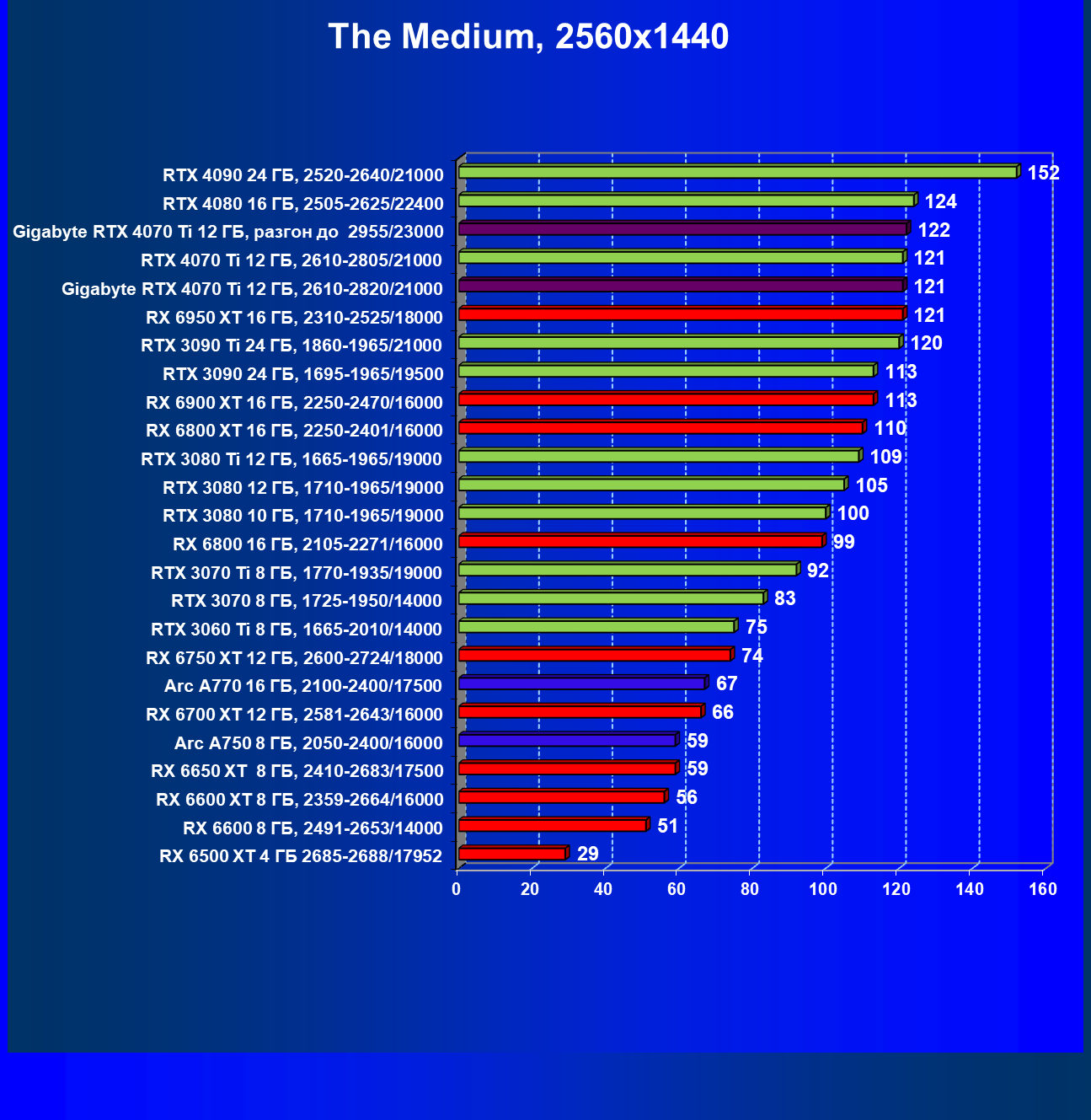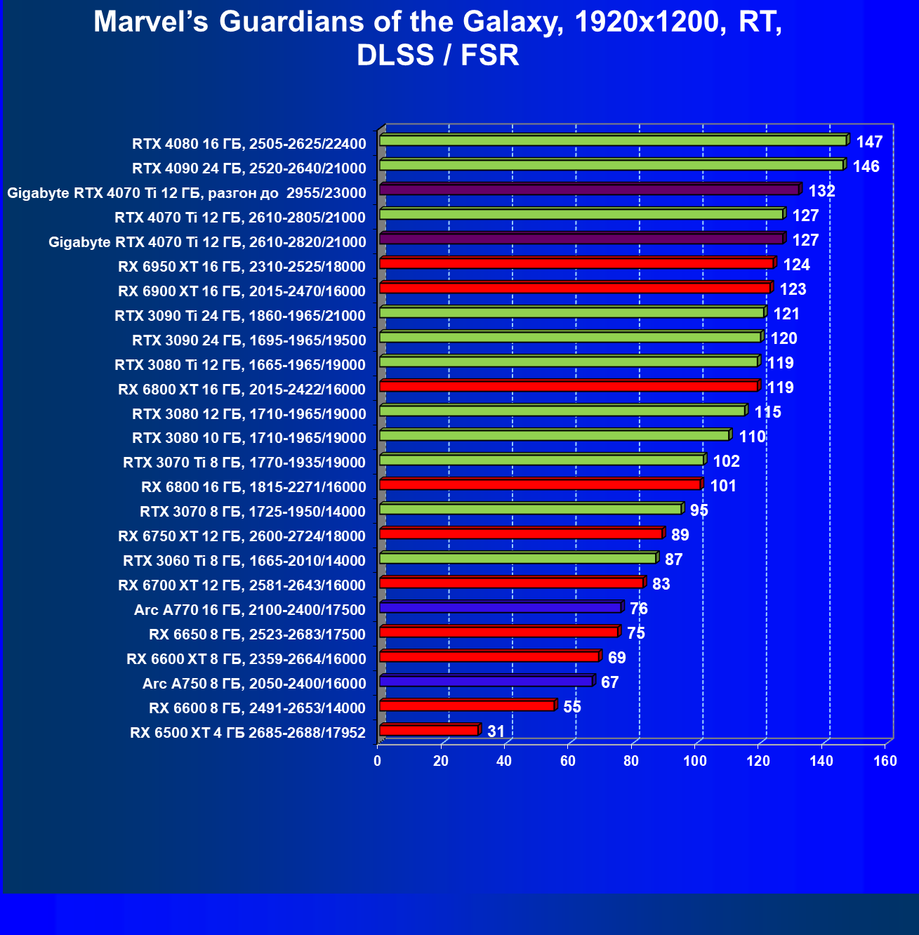 | 02 | Gigabyte RTX 4070 Ti Gaming OC 12 ГБ, разгон до 2955/23000 | 157 | 1321 | 84 000 |