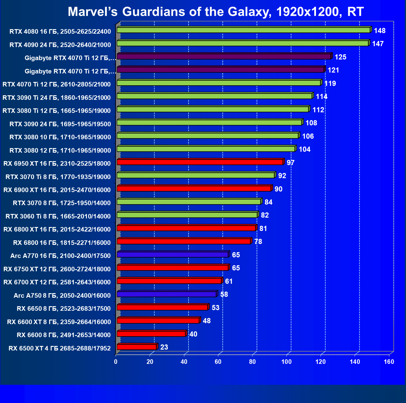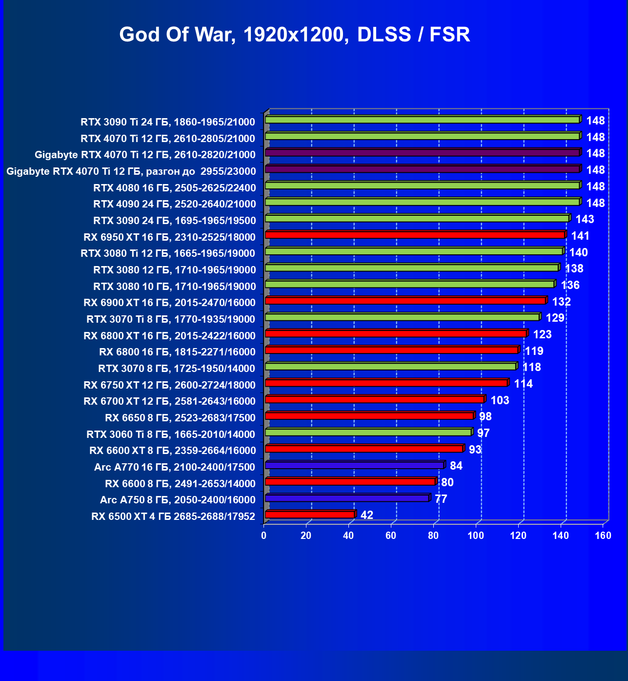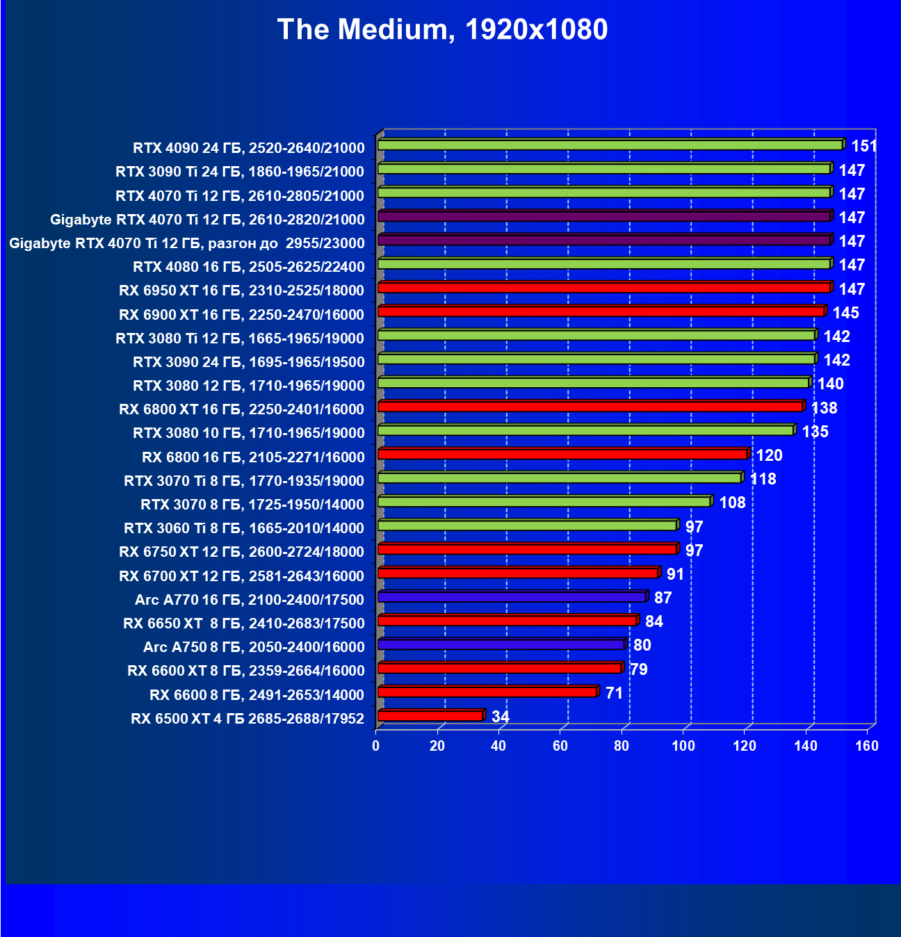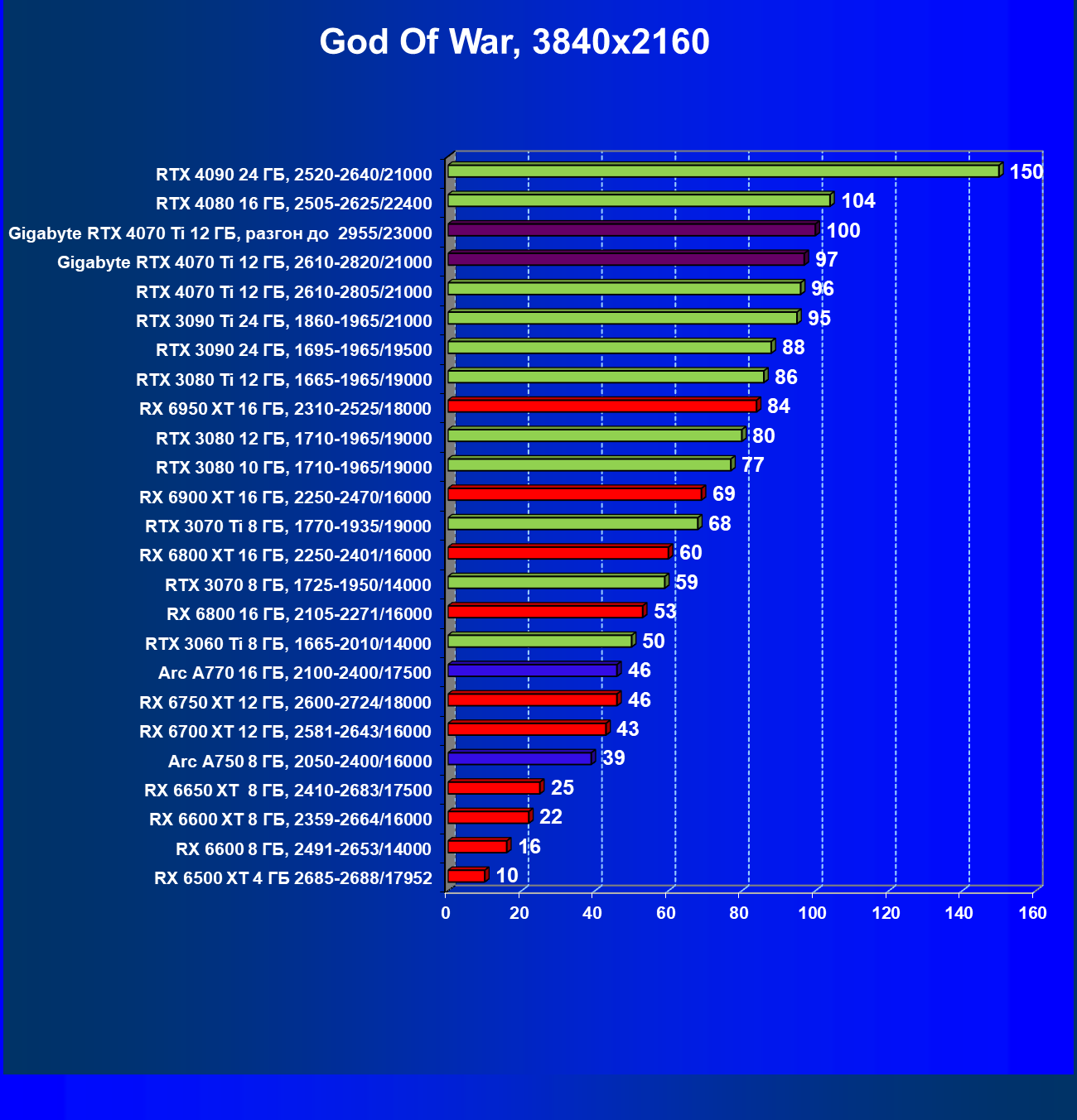 | 03 | Gigabyte RTX 4070 Ti Gaming OC 12 ГБ, 2610—2820/21000 | 151 | 1270 | 84 000 |
