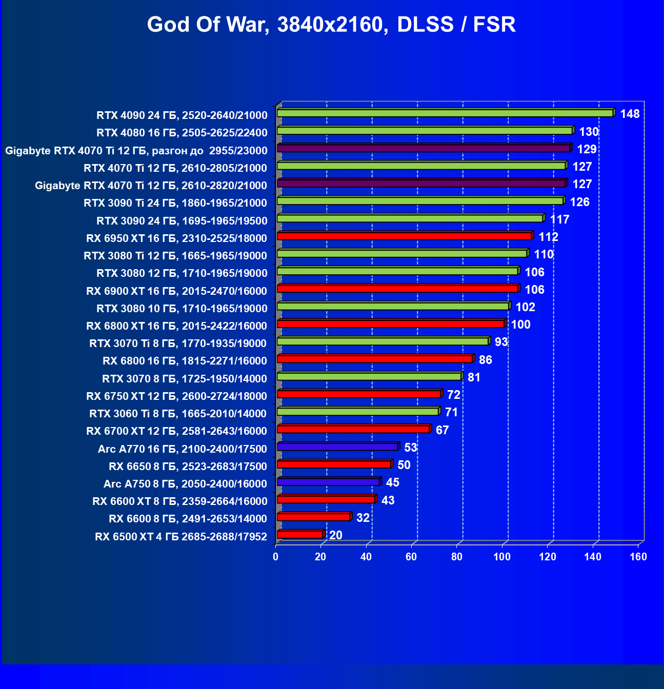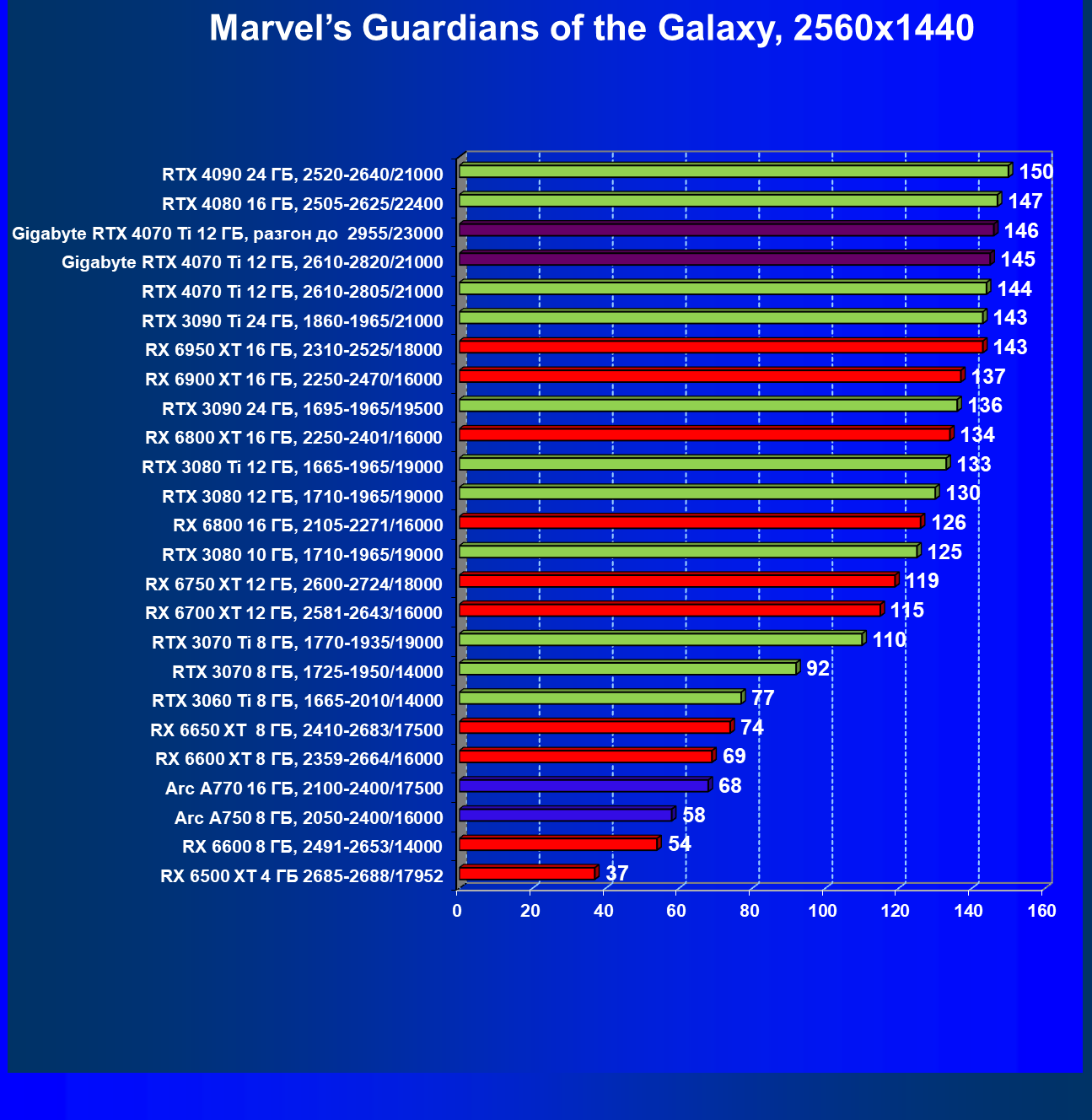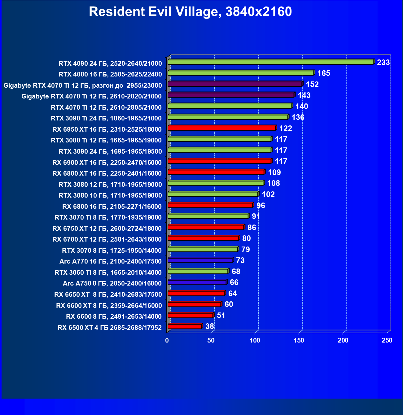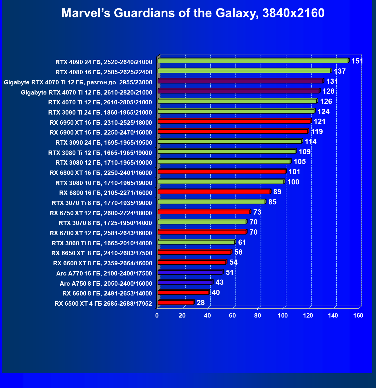 | 03 | Gigabyte RTX 4070 Ti Gaming OC 12 ГБ, 2610—2820/21000 | 151 | 1270 | 84 000 |