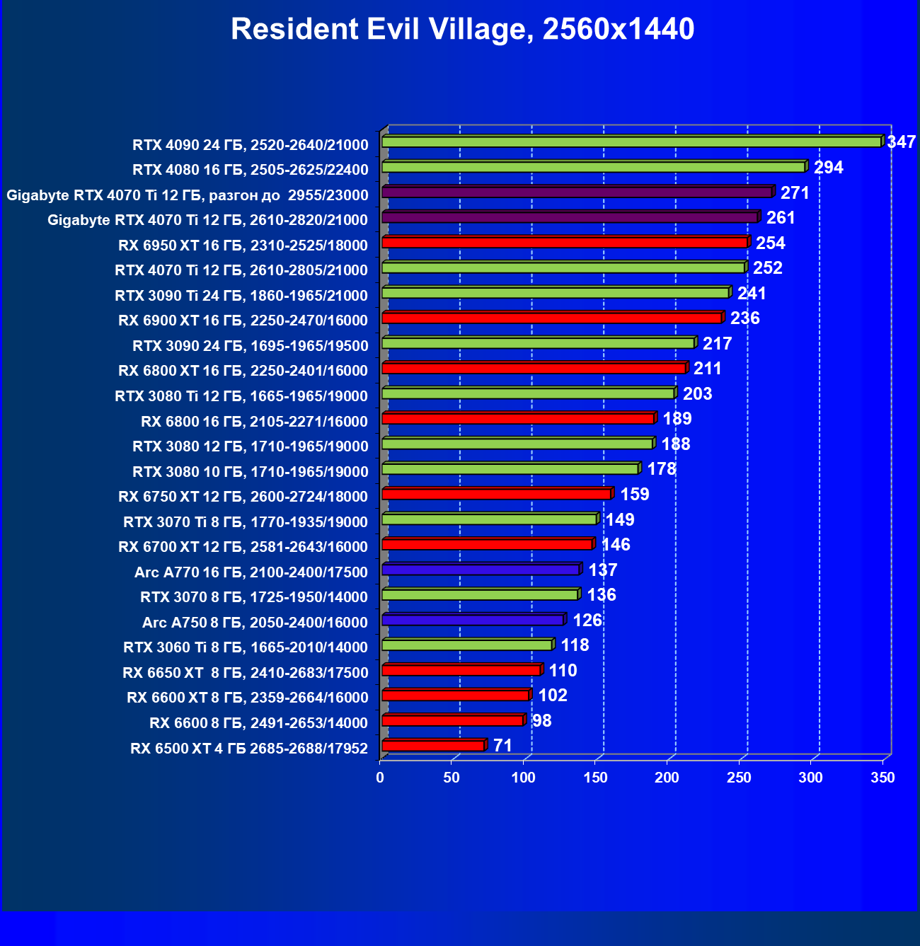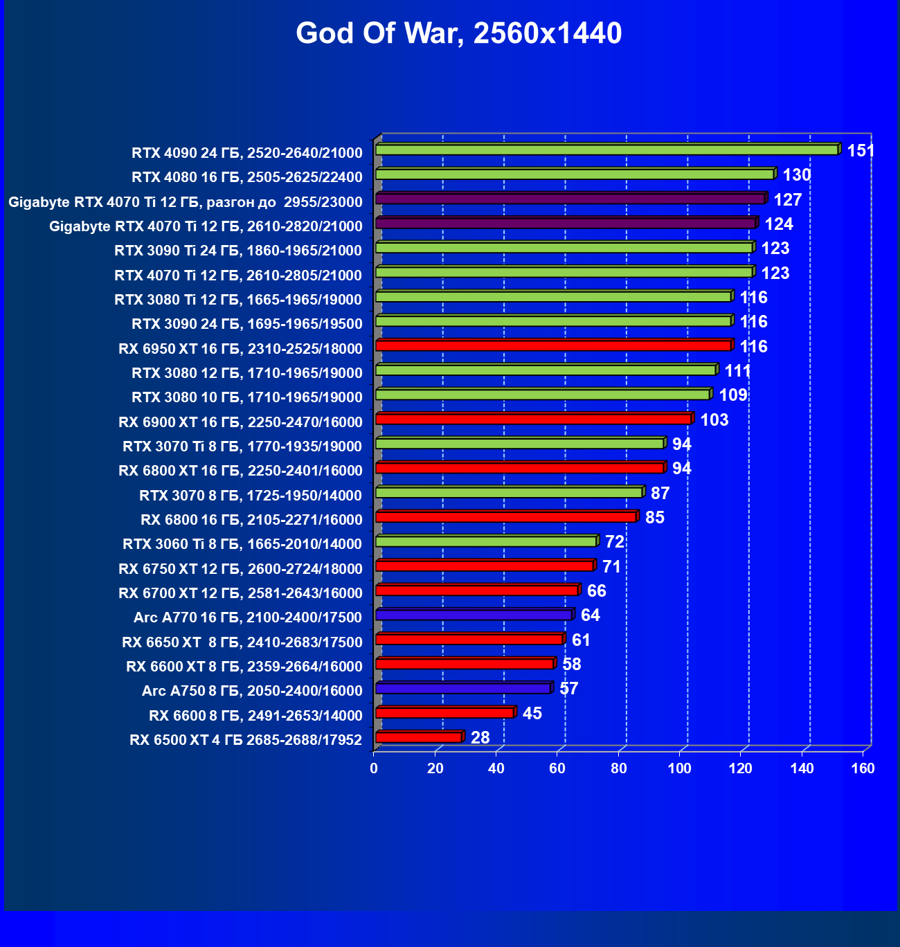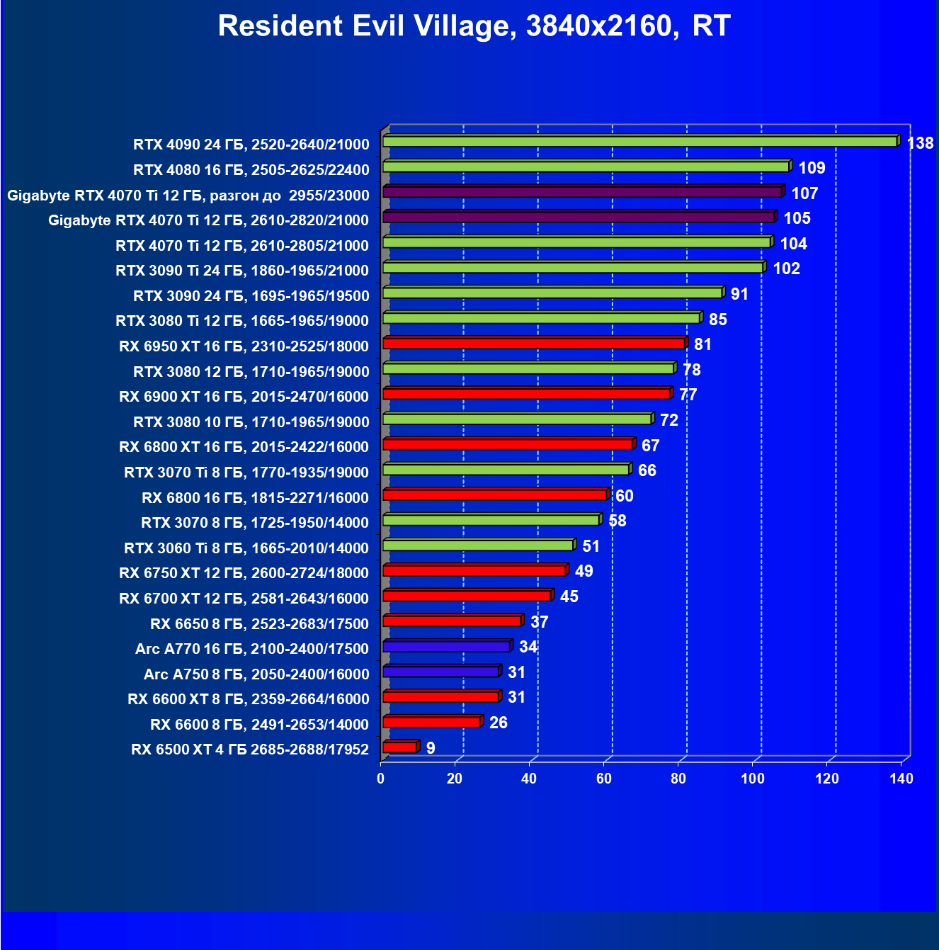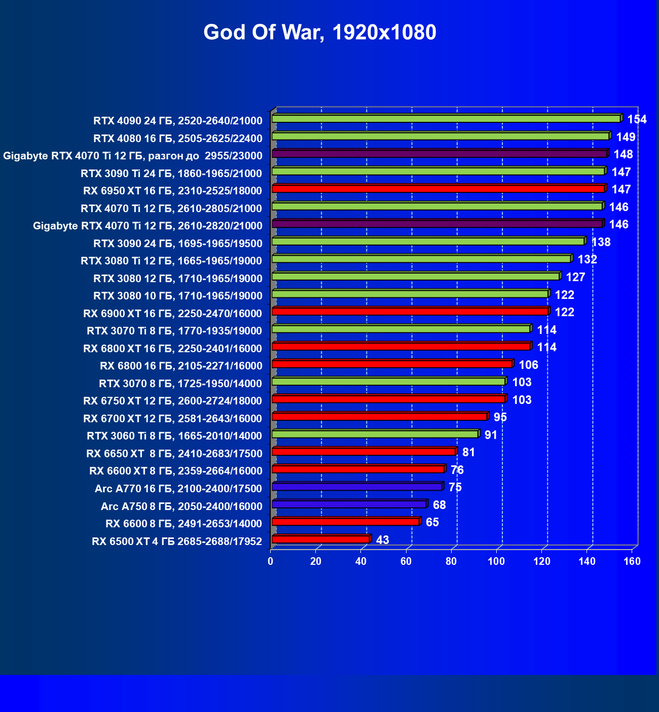 | 03 | Gigabyte RTX 4070 Ti Gaming OC 12 ГБ, 2610—2820/21000 | 151 | 1270 | 84 000 |