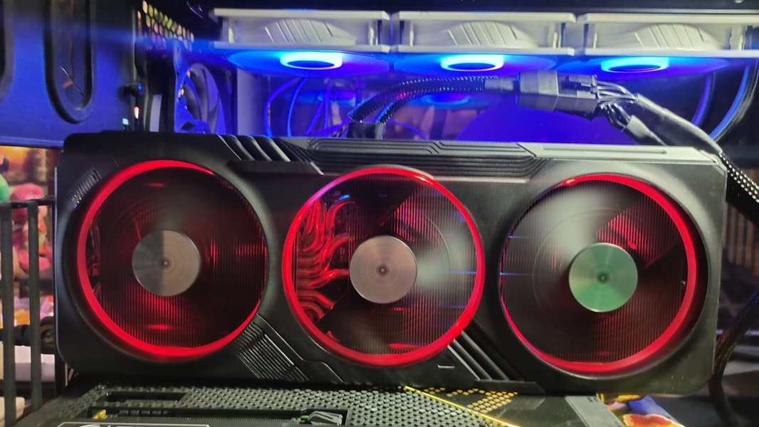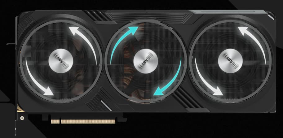 Технология вращения центрального вентилятора в противоположную сторону уже не является новинкой, а такая концепция работы применялась и во многих моделях 3xxx серии. Такая работа вентиляторов в довесок с 3-мя вентиляторами демонстрирует снижение турбулентности воздушного потока, что приводит к более эффективному охлаждению всех имеющихся контроллеров и микросхем находящихся на PCB.
