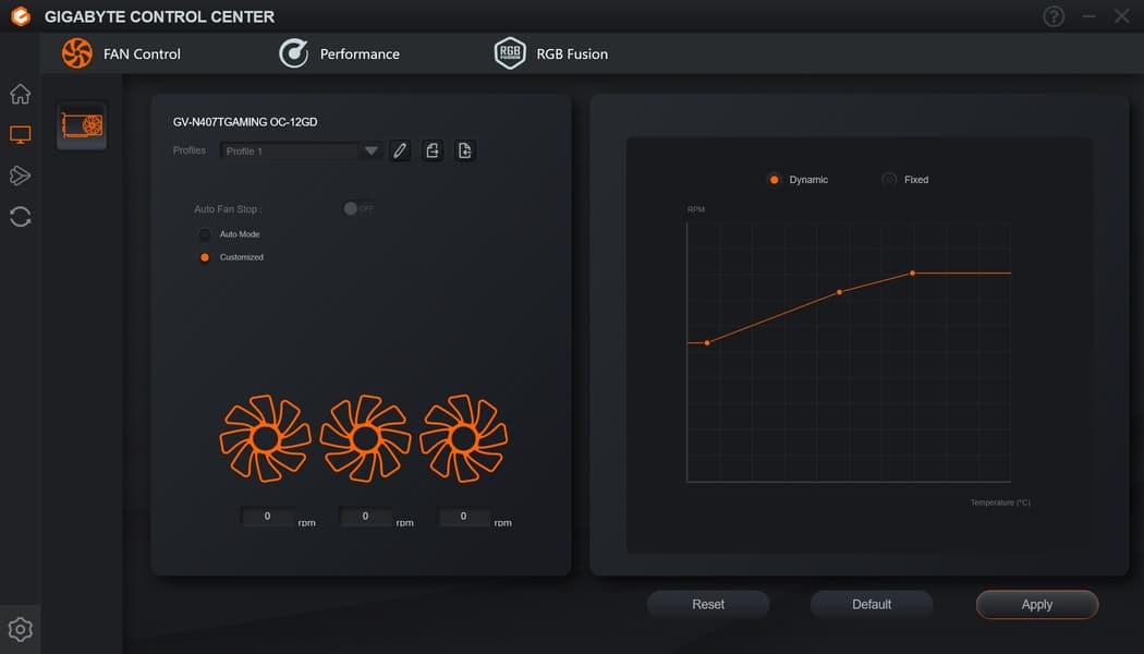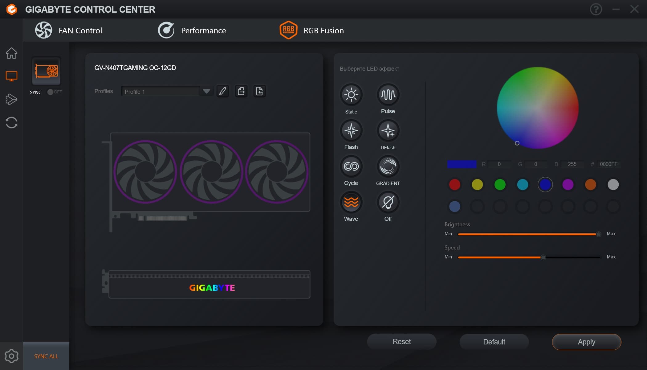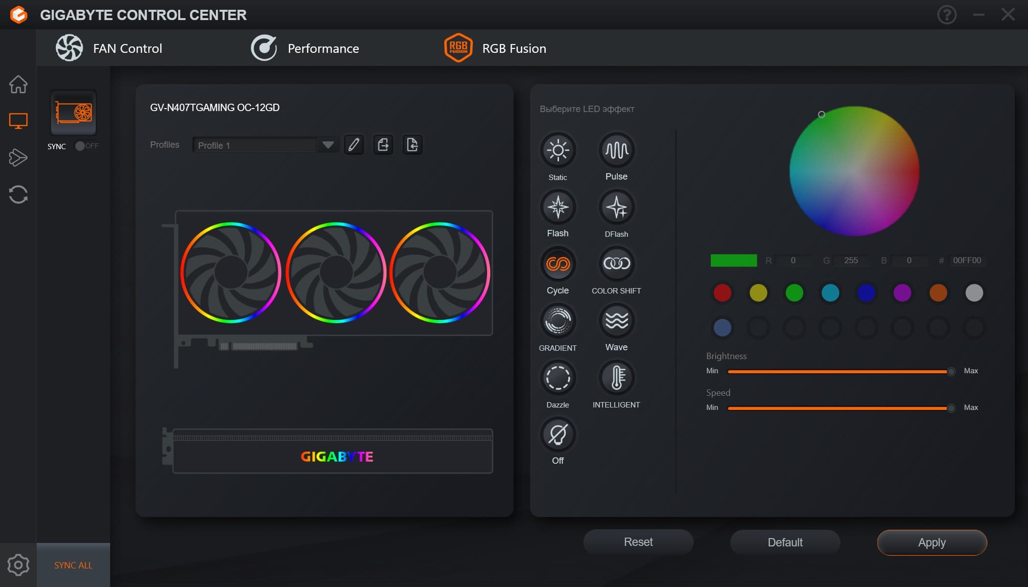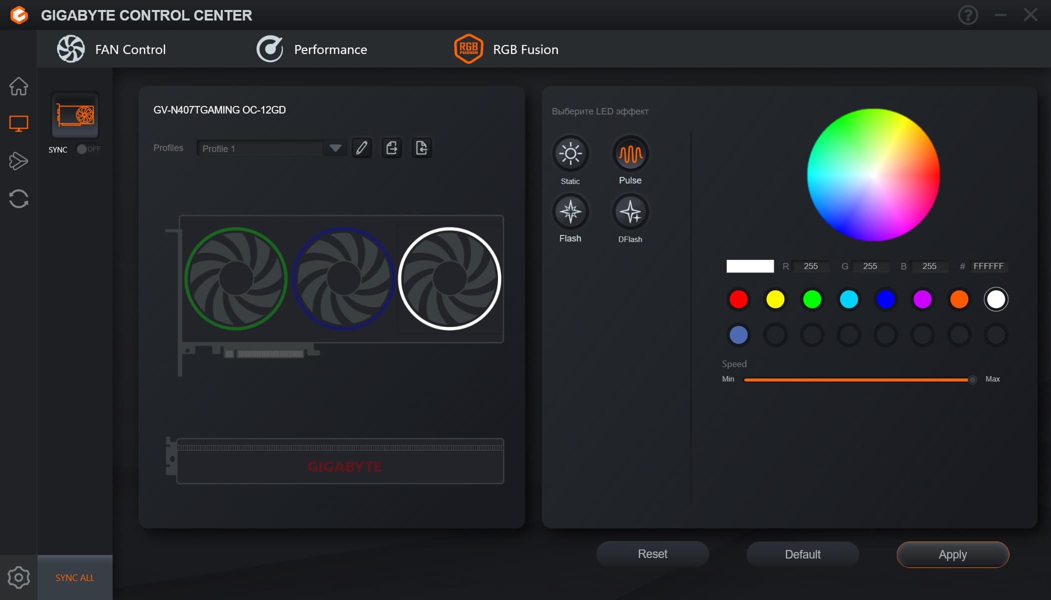 Управление традиционно осуществляется через утилиту Gigabyte Control Center. Стоит отметить интересный режим свечения на ободах, когда скорость смены цветов соответствует частоте вращения вентиляторов.