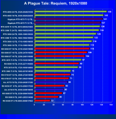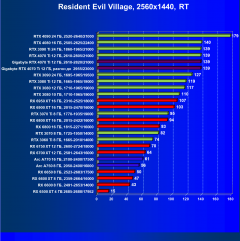 В данном случае лидерство RTX 4070 Ti выражено еще более ярко относительно флагманов AMD вследствие большего падения производительности у тех при включении RT. В среднем прирост производительности относительно RTX 3090 Ti по всем разрешениям составляет 2,5%, а в разрешении 4К — 4%. Разница же в производительности с RX 6950 XT в данном случае составляет 20% по всем разрешениям и аж 46% в 4K. Карта Gigabyte смотрится еще более выигрышно засчет повышенных частот работы.