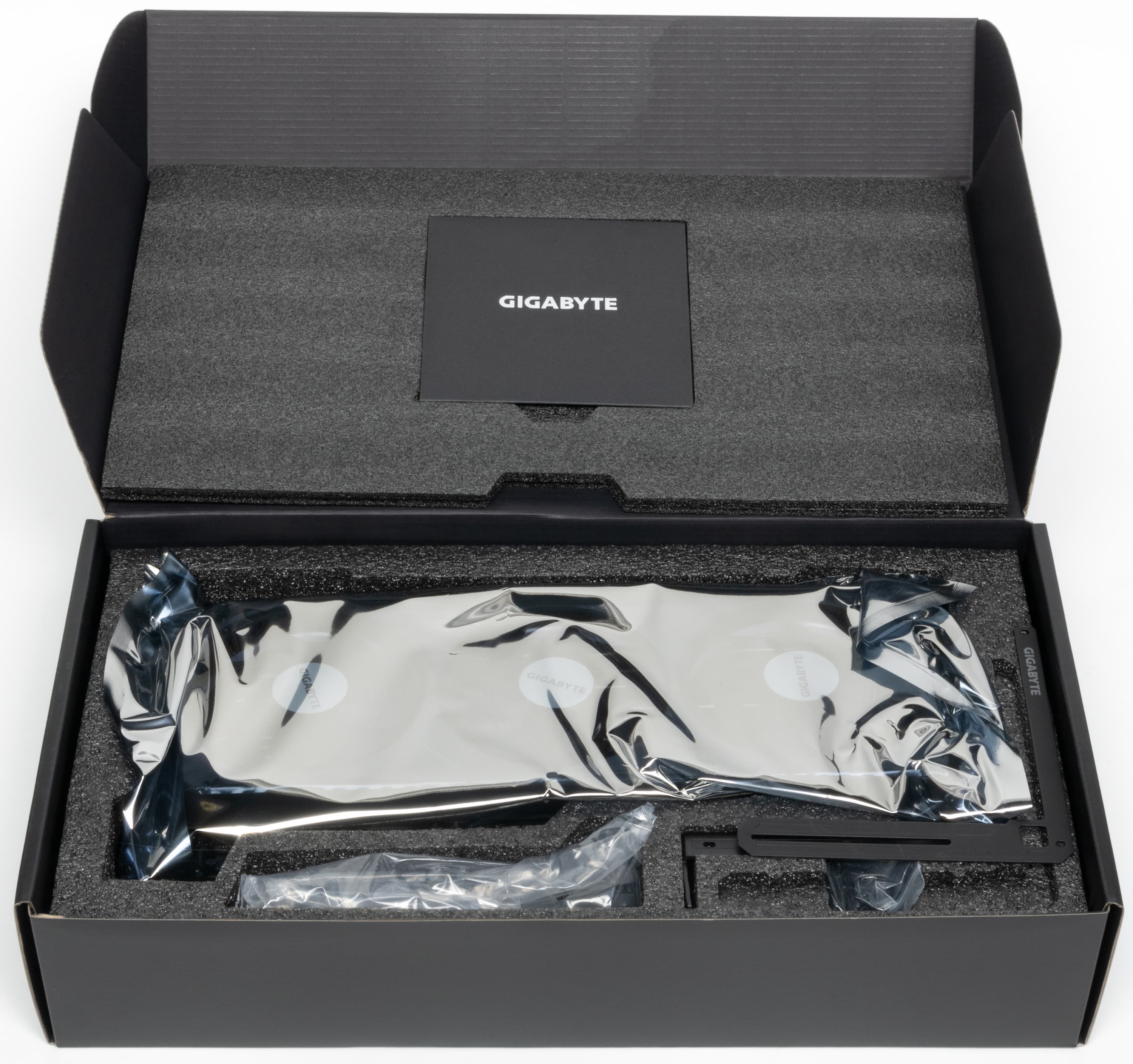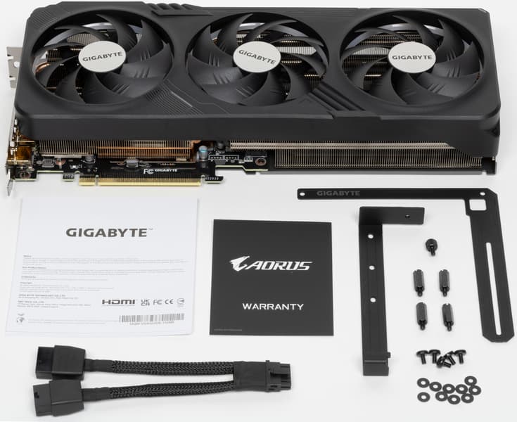 Рассмотренная карта Gigabyte имеет длину более 30 см и занимает 4 слота в корпусе, что надо учитывать при планировании апгрейда своего ПК. В комплекте поставки есть поддерживающий штатив.