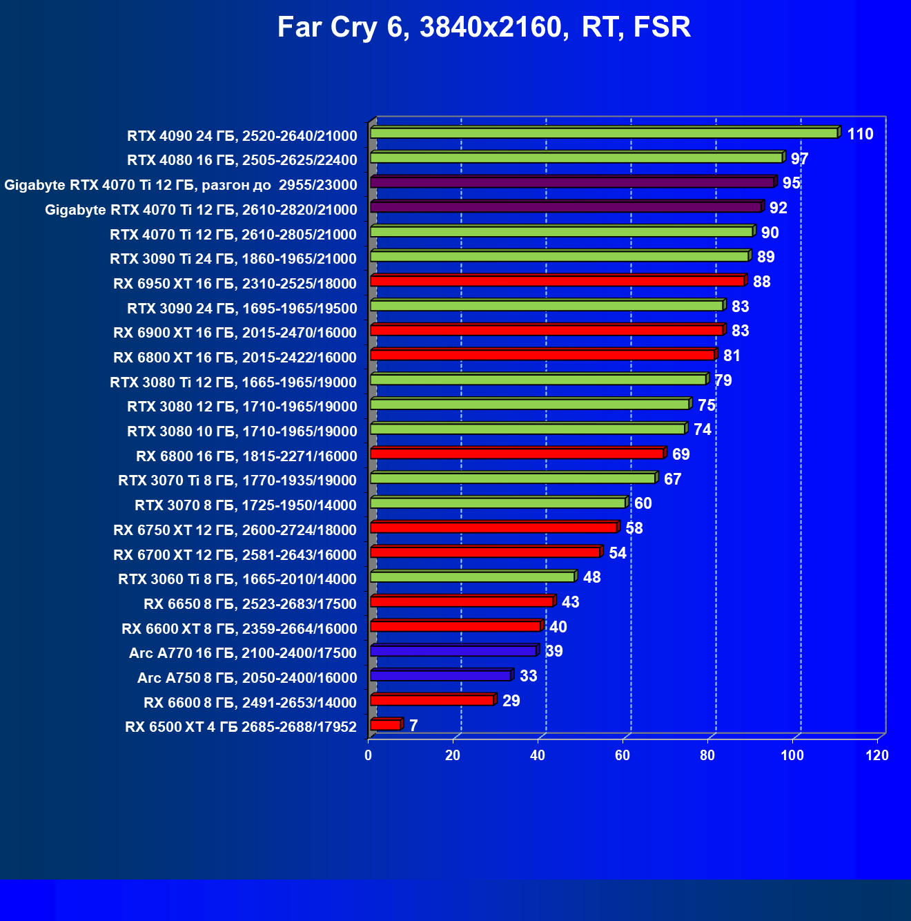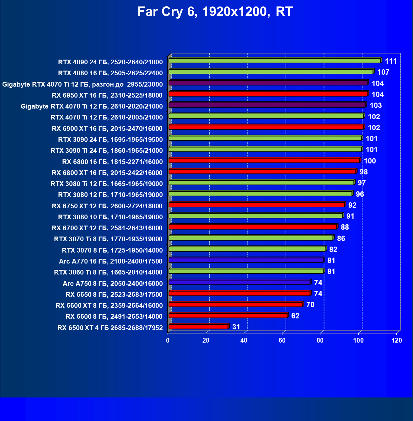 | 23 | RX 6950 XT 16 ГБ, 2310—2525/18000 | 107 | 892 | 83 100 |