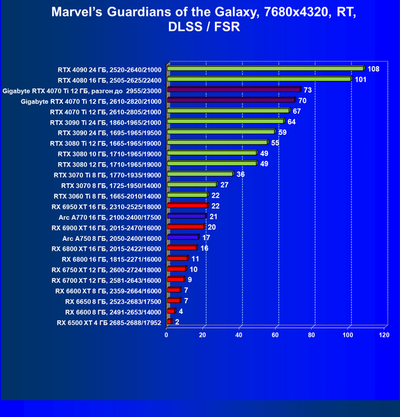 | 03 | Gigabyte RTX 4070 Ti Gaming OC 12 ГБ, разгон до 2955/23000 | 482 | 57 | 84 000 |