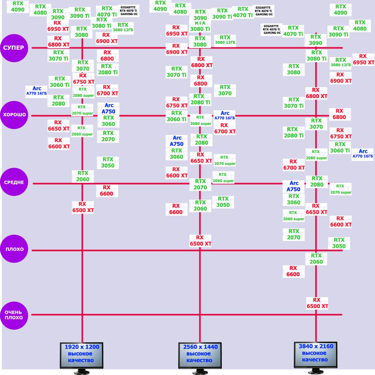 Новинка от Nvidia в лице RTX 4070 Ti отправляет топовые карты 2020 — 2022 годов на скамью запасных, «красную карточку» заслуженно получают RTX 3090/3090 Ti из-за своей меньшей производительности, но более высокой цены. Карты от AMD RX 6900 XT и RX 6950 XT сильно отстают по производительности, имея при этом схожие с новинкой ценники. За компанию вставил в рейтинг RTX 4080 16 ГБ с его более высокой ценой и сверх производительностью, даже эта карта оказывается выгоднее, чем RTX 3090 Ti.