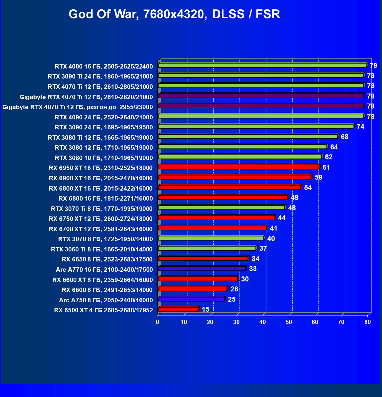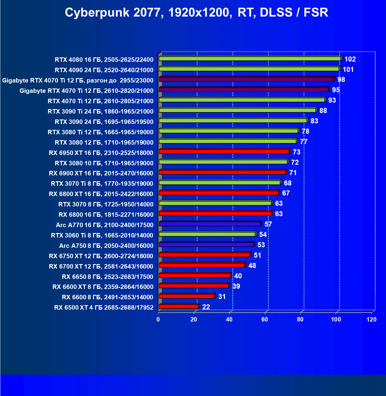 | 17 | Gigabyte RTX 4070 Ti Gaming OC 12 ГБ, разгон до 2955/23000 | 57 | 482 | 84 000 |