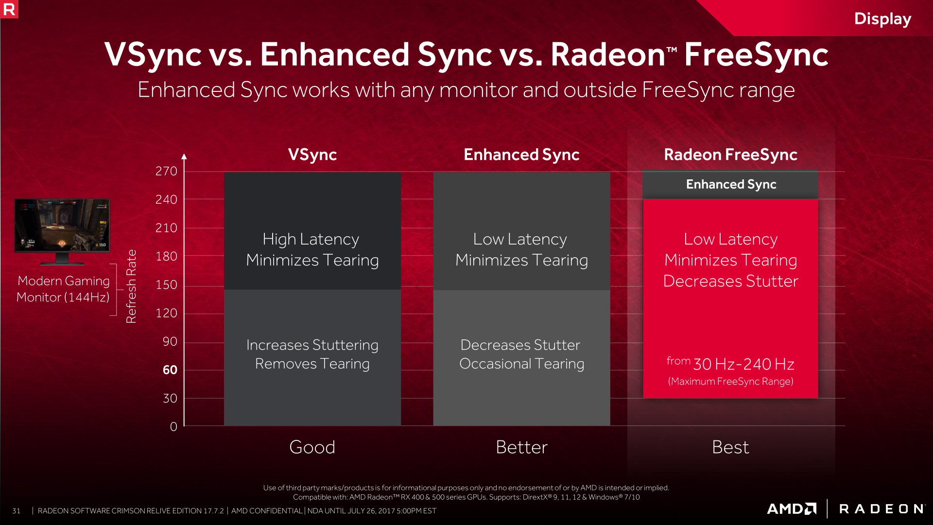 Стоит отметить и технологию AMD LFC (Low Framerate Compensation), входящую в комплекс FreeSync. Она расширяет диапазон частот обновления экрана и увеличивает плавность игрового процесса при частотах до 30 кадров в секунду. Эффективность подобного метода воздействия до сих пор для многих находится под вопросом, поскольку при 30 fps и менее в любом случае сложно представить себе плавный и комфортный геймплей.
