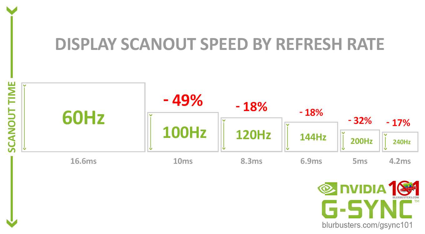 Если оперировать цифрами, то максимальное время любого цветового перехода не должно превышать время, предоставленное монитору на один кадр (1000 мс / 60 Гц = 16,66 мс или 1000 мс / 144 Гц = 6,94 мс, и т. д.). Чем больше несоответствие, тем сильнее шлейфы. Желание нивелировать это несоответствие обязательно приведет вас к наиболее достойным представителям лагеря TN+Film либо к большим тратам при покупке топовых IPS-решений.