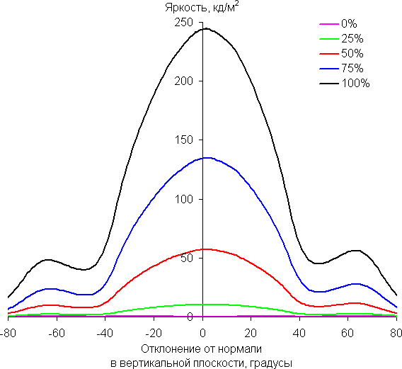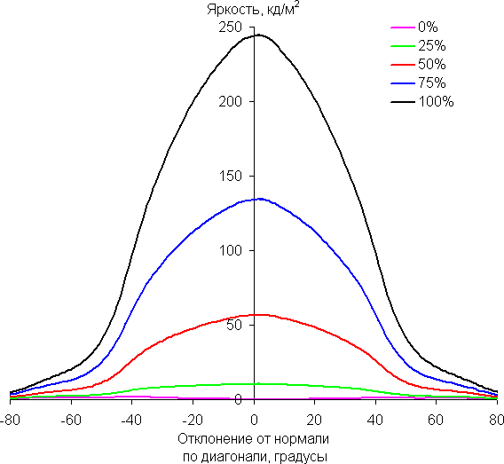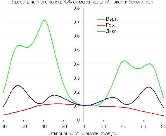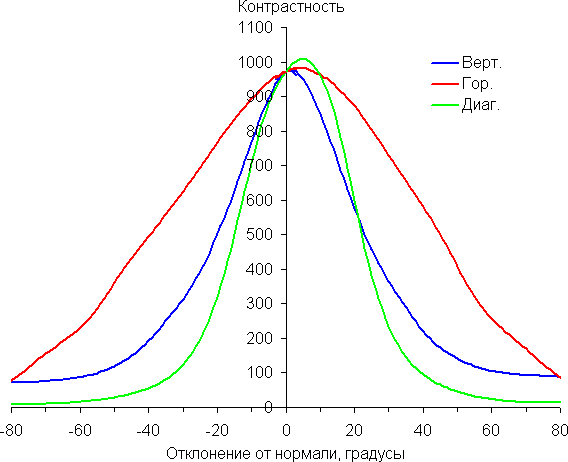 Отметим плавное уменьшение яркости при отклонении от перпендикуляра к экрану в горизонтальном направлении, при этом графики не пересекаются во всем диапазоне измеряемых углов. Чуть быстрее падает яркость при отклонении в вертикальном направлении. При отклонении в диагональном направлении поведение яркости оттенков имеет промежуточный характер между вертикальным и горизонтальным направлениями, за исключением яркости черного поля, которая начинает резко возрастать уже при 20°-30° отклонения от перпендикуляра к экрану. Если сидеть от экрана на расстоянии 50-60 см, то черное поле по углам будет заметно светлее, чем в центре. Контрастность в диапазоне углов ±82° в случае отклонения по диагонали приближается к отметке 10:1, и опускается ниже при отклонении к одному углу более, чем на 70°.
