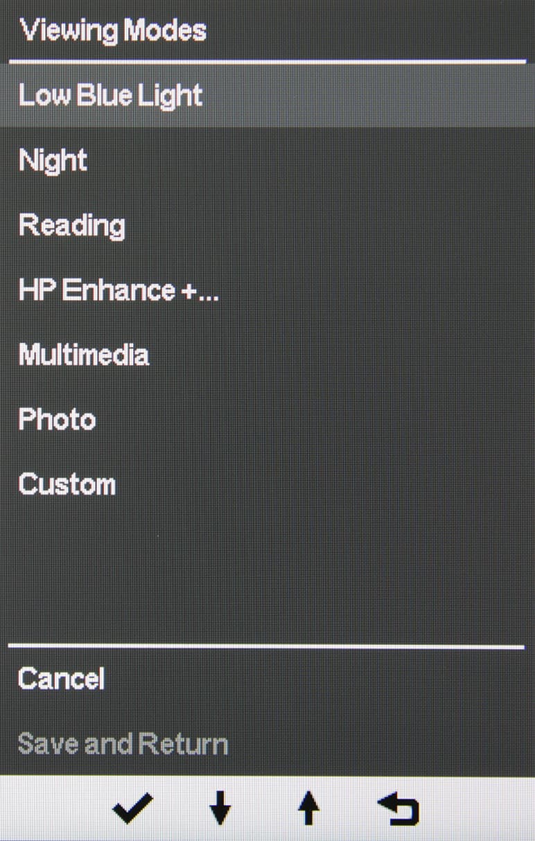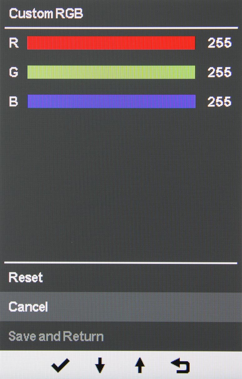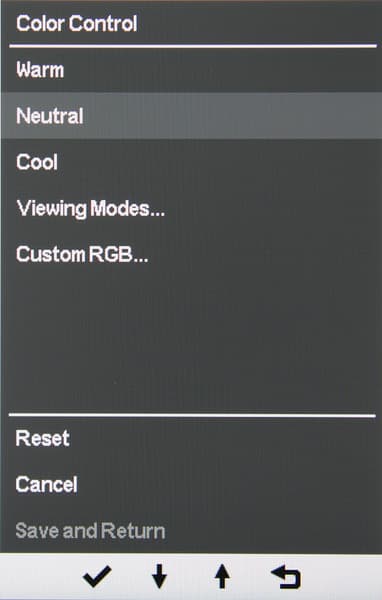 Присутствуют стандартные настройки Яркость и Контрастность (они вынесены в главное меню). Цветовой баланс устанавливается выбором одного из трех предустановленных профилей или ручной регулировкой интенсивности трех основных цветов. Дополнительно есть набор профилей с уменьшенной интенсивностью синей компоненты (Viewing Modes).