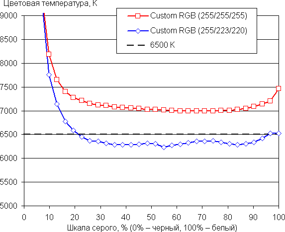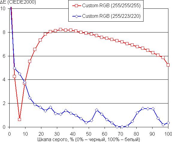 Цветопередача при выборе предустановленных профилей несколько отличается от стандартной, поэтому мы попытались вручную скорректировать цвета, регулируя усиление трех основных цветов. Графики ниже показывают цветовую температуру на различных участках шкалы серого и отклонение от спектра абсолютно черного тела (параметр ΔE) без коррекции (это самый яркий режим) и после ручной коррекции: