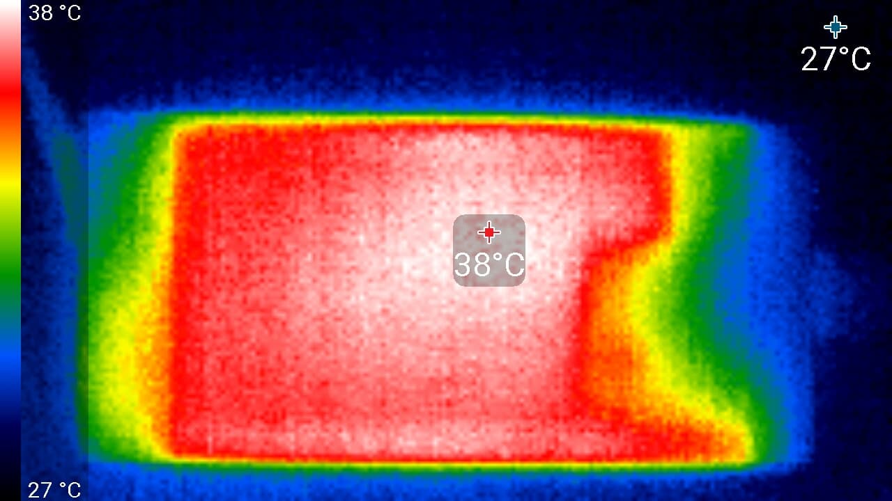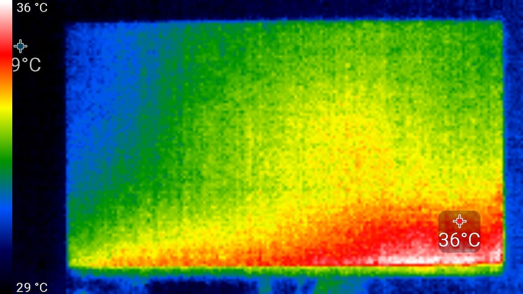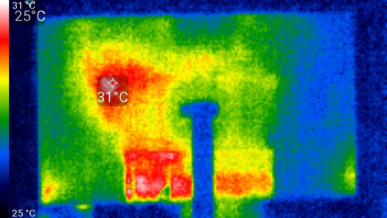 Спереди в нижней части экрана была зафиксирована температура в 36 °C — видимо, там находится светодиодная линейка подсветки экрана. Сзади локально температура достигает 31 °C, это совсем немного. Корпус БП нагрелся всего до 38 °C, что неудивительно, так как его мощность высокая, а к монитору не были подключены внешние устройства.