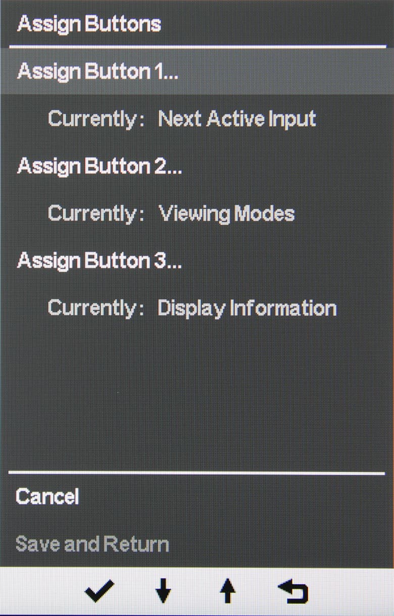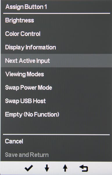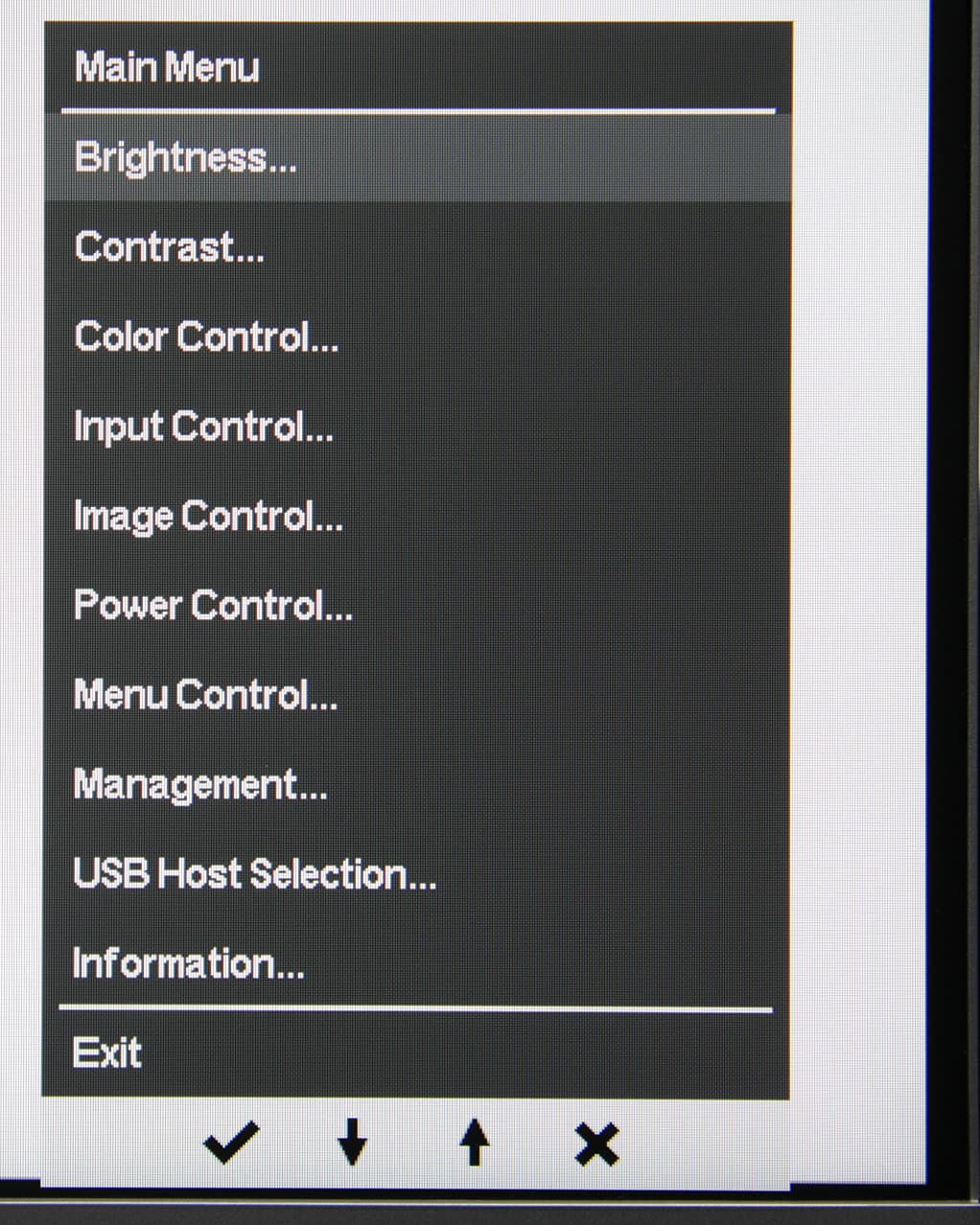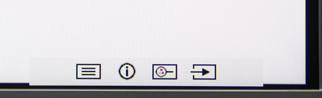 Индикатор питания при работе весьма ярко светится белым, в режиме ожидания — менее ярко оранжевым и не горит, если монитор условно (механического выключателя питания, к сожалению, нет) выключен. Индикатор питания в меню можно выключить совсем. Когда монитор работает и на экране нет меню, то при первом нажатии на любую кнопку, кроме кнопки питания, на экран выводится стартовое меню в виде четырех значков точно над кнопками.