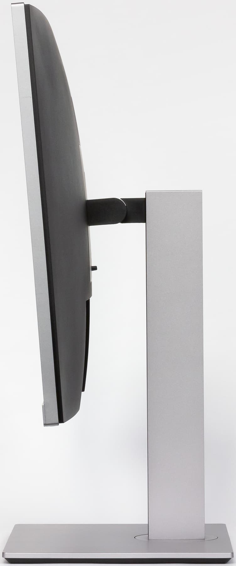 Основание подставки относительно большое по площади, но оно сверху плоское и горизонтальное, что повышает эффективность использования рабочей площади стола. Стойка имеет фиксированную высоту, при этом подпираемый пружиной механизм с рельсовым стальным шариковым подшипником обеспечивает вертикальное перемещение шарнира, на который крепится блок экрана. Штатная подставка позволяет немного наклонить блок экрана вперед, отклонить назад, приподнять-опустить, повернуть вправо-влево и перевернуть в портретную ориентацию по и против часовой стрелки.