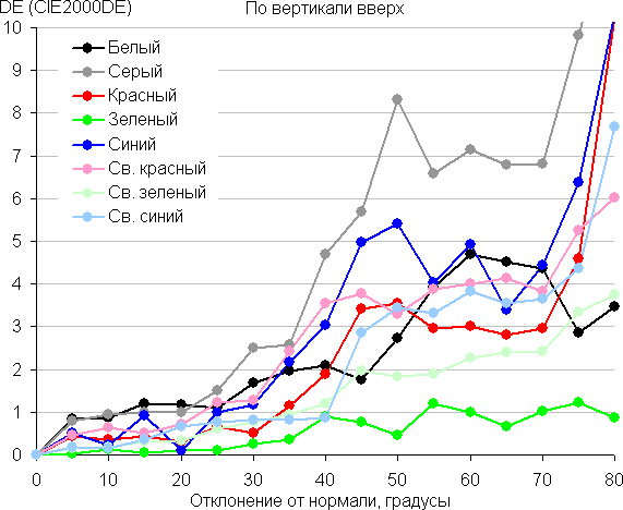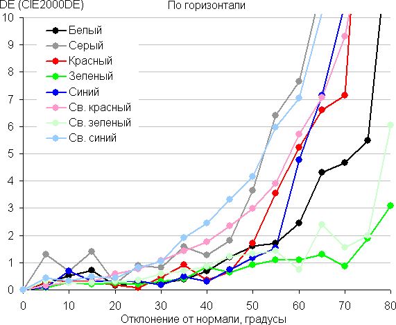 Для количественной характеристики изменения цветопередачи мы провели колориметрические измерения для белого, серого (127, 127, 127), красного, зеленого и синего, а также светло-красного, светло-зеленого и светло-синего полей во весь экран с использованием установки, подобной той, что применялась в предыдущем тесте. Измерения проводились в диапазоне углов от 0° (датчик направлен перпендикулярно к экрану) до 80° с шагом в 5°. Полученные значения интенсивностей были пересчитаны в ΔE относительно замера каждого поля при перпендикулярном положении датчика относительно экрана. Результаты представлены ниже: