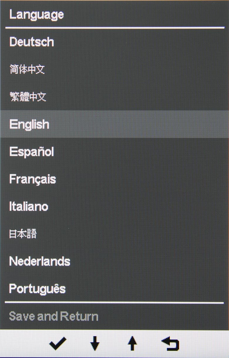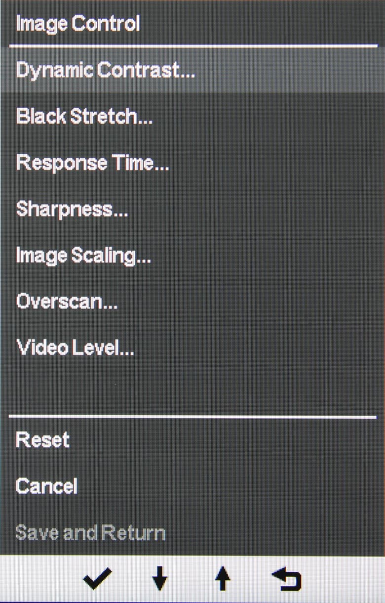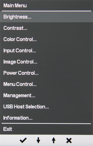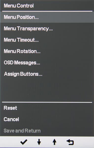 При навигации по меню над кнопками выводятся значки-подсказки по текущим функциям. Меню достаточно крупное, надписи читаемые. Списки зациклены, но в целом навигация не очень удобная, так как для выполнения простых действий требуется много раз нажимать на кнопки. При настройке изображения меню остается на экране, что, впрочем, почти не мешает оценке вносимых изменений. При необходимости можно установить уровень прозрачности фона, выбрать тайм-аут автоматического выхода из меню, включить блокировку навигационных кнопок и/или кнопки питания, чтобы предотвратить нежелательное изменение настроек и случайное выключение монитора, передвинуть меню по горизонтали и по вертикали, повернуть меню с шагом в 90 градусов, отключить вывод некоторых сообщений. Русской версии экранного меню нет.