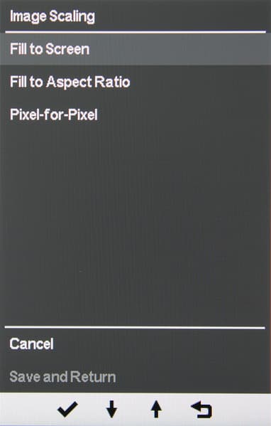Режимов геометрической трансформации три: выполняется принудительное растягивание картинки на всю площадь экрана, изображение увеличивается до границ экрана с сохранением исходных пропорций (они считаются по пикселям) или картинка выводится один к одному по пикселям в центре экрана. В тех случаях, когда изображение занимает не всю площадь экрана, оставшиеся поля заливаются черным. Отдельно включается/выключается небольшое увеличение с обрезкой по периметру исходного изображения.