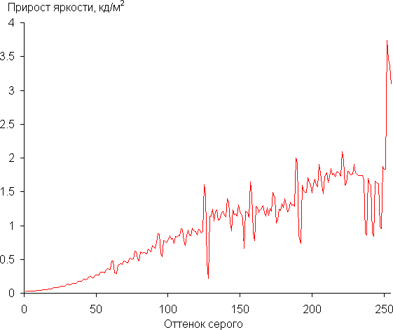 Мы измерили яркость 256 оттенков серого (от 0, 0, 0 до 255, 255, 255). График ниже показывает прирост (не абсолютное значение!) яркости между соседними полутонами: