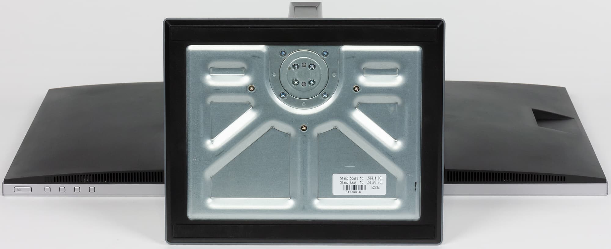 Чтобы выдержать вес монитора, основание подставки и ряд ответственных деталей изготовлены из алюминиевого сплава и толстой штампованной стали. Видимые пользователю алюминиевые детали — высокая П-образная рамка и круг, на который она опирается, — имеют матовое серебристое покрытие. Конструкция подставки достаточно жесткая, а ее вес относительно большой, что обеспечивает монитору хорошую устойчивость. Резиновые накладки снизу на основании подставки защищают поверхность стола от царапин и предотвращают скольжение монитора на гладких поверхностях.