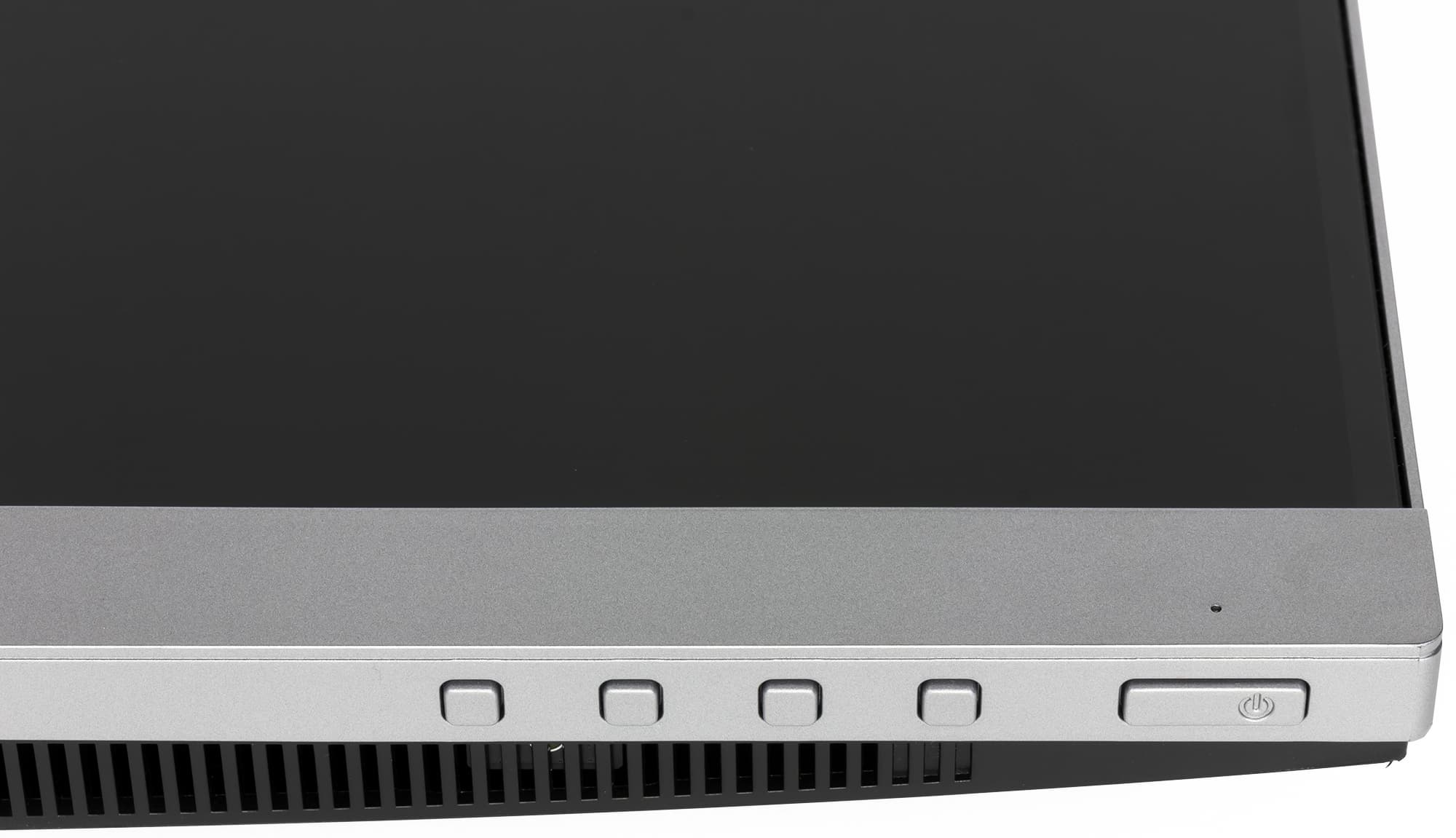 Справа на нижнем торце размещены кнопки управления. Никаких обозначений и меток нет, кнопки приходится находить на ощупь. Впрочем, при выводе меню метки кнопок на экране есть, что упрощает процесс настройки монитора. Кнопка питания — самая крайняя и больше, также над ней выше спереди есть отверстие индикатора состояния, это позволяет быстро находить данную кнопку.