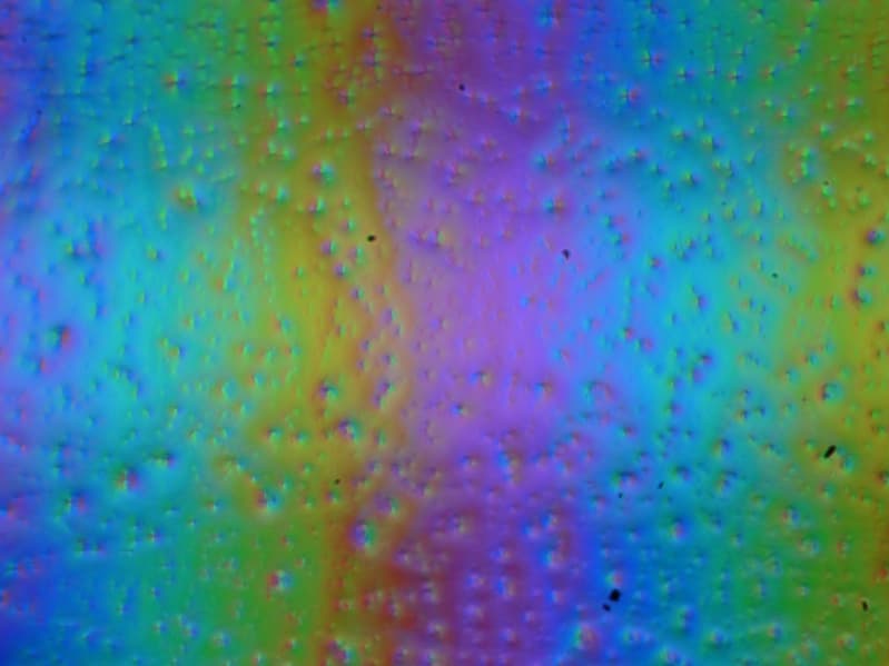 Зерно этих дефектов в несколько раз меньше размеров субпикселей (масштаб этих двух фотографий одинаковый), поэтому фокусировка на микродефектах и «перескок» фокуса по субпикселям при изменении угла зрения выражены слабо, из-за этого практически нет и «кристаллического» эффекта.