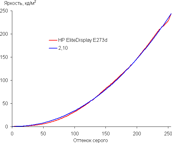 Аппроксимация полученной гамма-кривой дала показатель 2,10, что немного ниже стандартного значения 2,2, при этом реальная гамма-кривая немного отклоняется от аппроксимирующей степенной функции, особенно это заметно в самой светлой области: