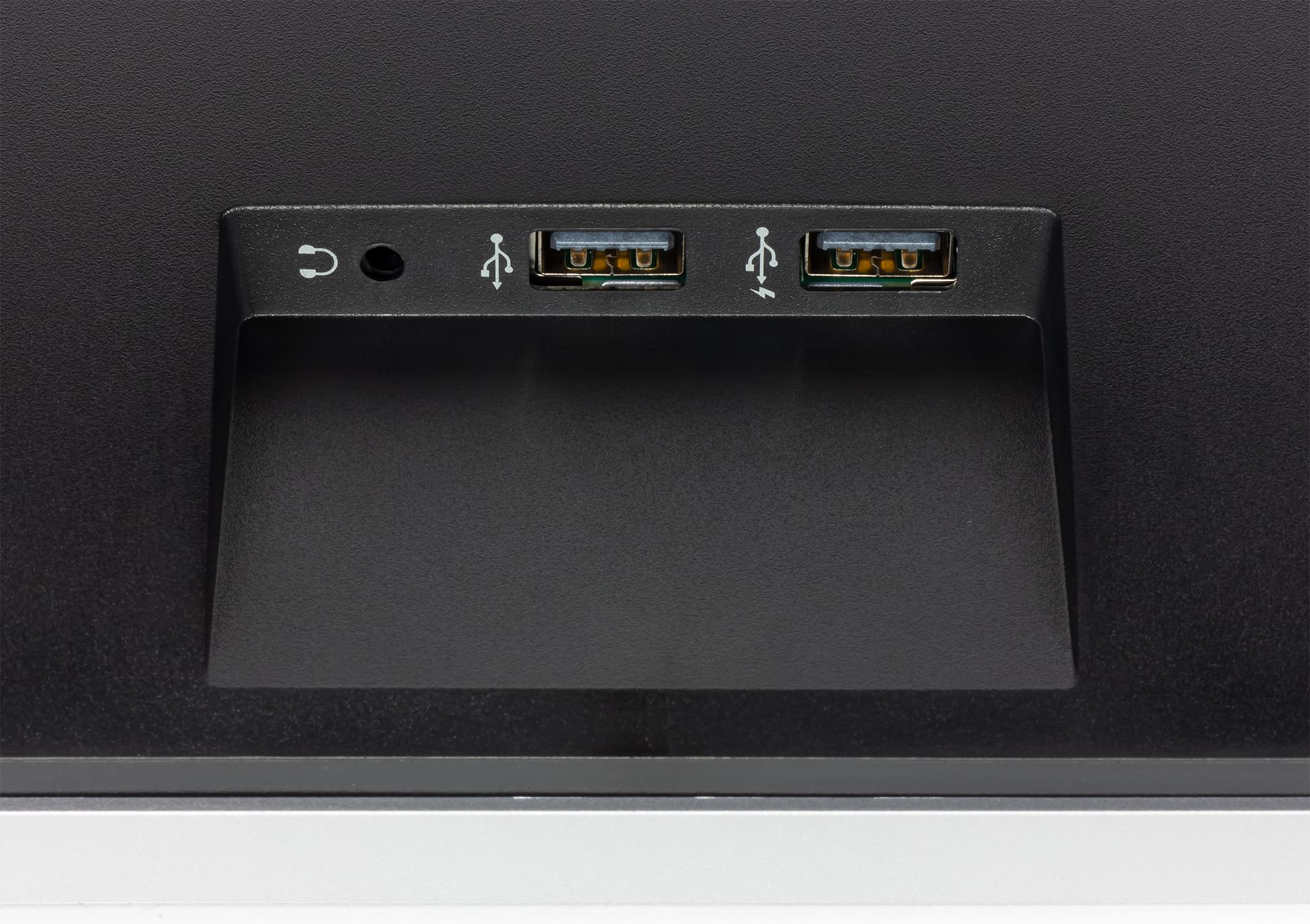 Дизайн монитора аккуратный, его даже можно назвать строгим, это ожидаемо для рабочего монитора. Видимый спереди преимущественно серебристый цвет будет хорошо гармонировать, например, с серебристым ноутбуком, для работы с которым в паре и предназначен монитор. Фронтальная поверхность экрана выглядит как монолитная черная полуматовая (зеркальность отчасти присутствует) плоскость, ограниченная снизу неширокой планкой, а с боков и сверху — узкой окантовкой.