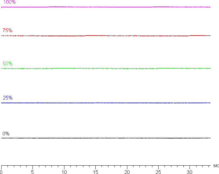 Яркость монитора меняется именно яркостью подсветки, то есть яркость монитора можно менять без ущерба для качества изображения (сохраняется контрастность и количество различимых градаций). Диапазон регулировки яркости позволяет с комфортом работать и смотреть фильмы как в освещенном помещении, так и в полной темноте. На любом уровне яркости мало-мальски значимая модуляция подсветки отсутствует, что исключает видимое мерцание экрана. В доказательство приведем графики зависимости яркости (вертикальная ось) от времени (горизонтальная ось) при различных значениях настройки яркости: