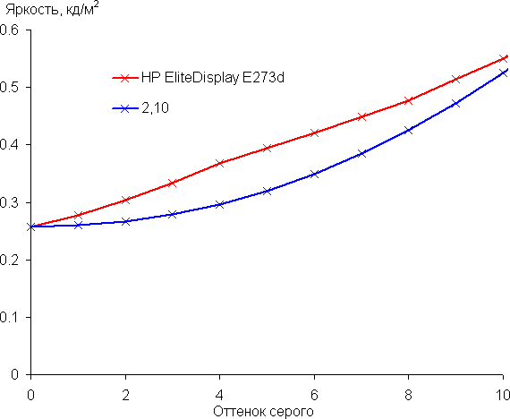 Рост прироста яркости на большей части шкалы серого более-менее равномерный, но в светах это не так. Каждый следующий оттенок значимо ярче предыдущего, даже в самой темной области: